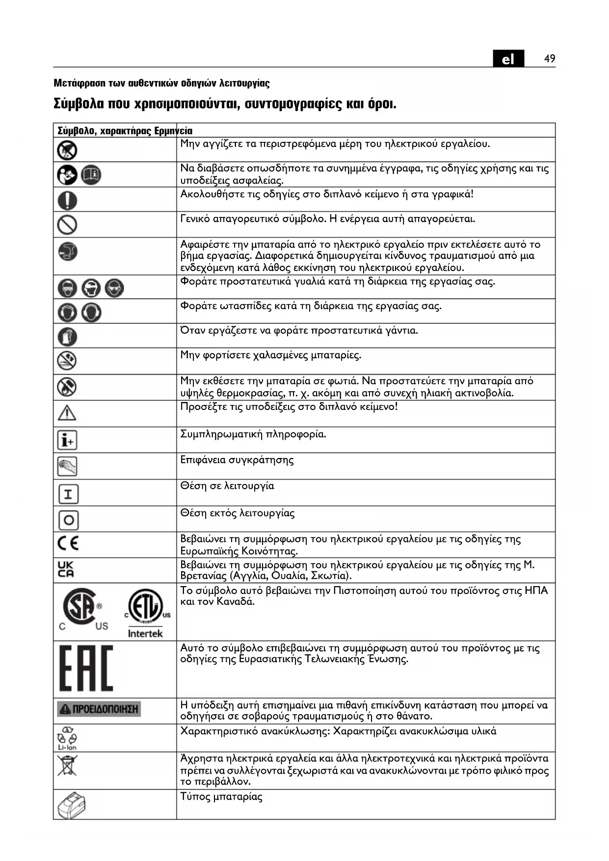 Μετάφραση των αυθεντικών οδηγιών λειτουργίας Σύμβολα που χρησιμοποιούνται, συντομογραφίες και όροι. Σύμβολο, χαρακτήρας Ερμηνεία Μην αγγίζετε τα περιστρεφόμενα μέρη του ηλεκτρικού εργαλείου. Να διαβάσετε οπωσδήποτε τα συνημμένα έγγραφα, τις οδηγίες χρήσης και τις υποδείξεις ασφαλείας. Ακολουθήστε τις οδηγίες στο διπλανό κείμενο ή στα γραφικά! Γενικό απαγορευτικό σύμβολο. Η ενέργεια αυτή απαγορεύεται. Αφαιρέστε την μπαταρία από το ηλεκτρικό εργαλείο πριν εκτελέσετε αυτό το βήμα εργασίας. Διαφορετικά δημιουργείται κίνδυνος τραυματισμού από μια ενδεχόμενη κατά λάθος εκκίνηση του ηλεκτρικού εργαλείου. Φοράτε προστατευτικά γυαλιά κατά τη διάρκεια της εργασίας σας. Φοράτε ωτασπίδες κατά τη διάρκεια της εργασίας σας. Όταν εργάζεστε να φοράτε προστατευτικά γάντια. Μην φορτίσετε χαλασμένες μπαταρίες. Μην εκθέσετε την μπαταρία σε φωτιά. Να προστατεύετε την μπαταρία από υψηλές θερμοκρασίας, π. χ. ακόμη και από συνεχή ηλιακή ακτινοβολία. Προσέξτε τις υποδείξεις στο διπλανό κείμενο! Συμπληρωματική πληροφορία. Επιφάνεια συγκράτησης Θέση σε λειτουργία Θέση εκτός λειτουργίας Βεβαιώνει τη συμμόρφωση του ηλεκτρικού εργαλείου με τις οδηγίες της Ευρωπαϊκής Κοινότητας. Βεβαιώνει τη συμμόρφωση του ηλεκτρικού εργαλείου με τις οδηγίες της Μ. Βρετανίας (Αγγλία, Ουαλία, Σκωτία). Το σύμβολο αυτό βεβαιώνει την Πιστοποίηση αυτού του προϊόντος στις ΗΠΑ και τον Καναδά. Αυτό το σύμβολο επιβεβαιώνει τη συμμόρφωση αυτού του προϊόντος με τις οδηγίες της Ευρασιατικής Τελωνειακής Ένωσης. Η υπόδειξη αυτή επισημαίνει μια πιθανή επικίνδυνη κατάσταση που μπορεί να οδηγήσει σε σοβαρούς τραυματισμούς ή στο θάνατο. Χαρακτηριστικό ανακύκλωσης: Χαρακτηρίζει ανακυκλώσιμα υλικά Άχρηστα ηλεκτρικά εργαλεία και άλλα ηλεκτροτεχνικά και ηλεκτρικά προϊόντα πρέπει να συλλέγονται ξεχωριστά και να ανακυκλώνονται με τρόπο φιλικό προς το περιβάλλον. Τύπος μπαταρίας50