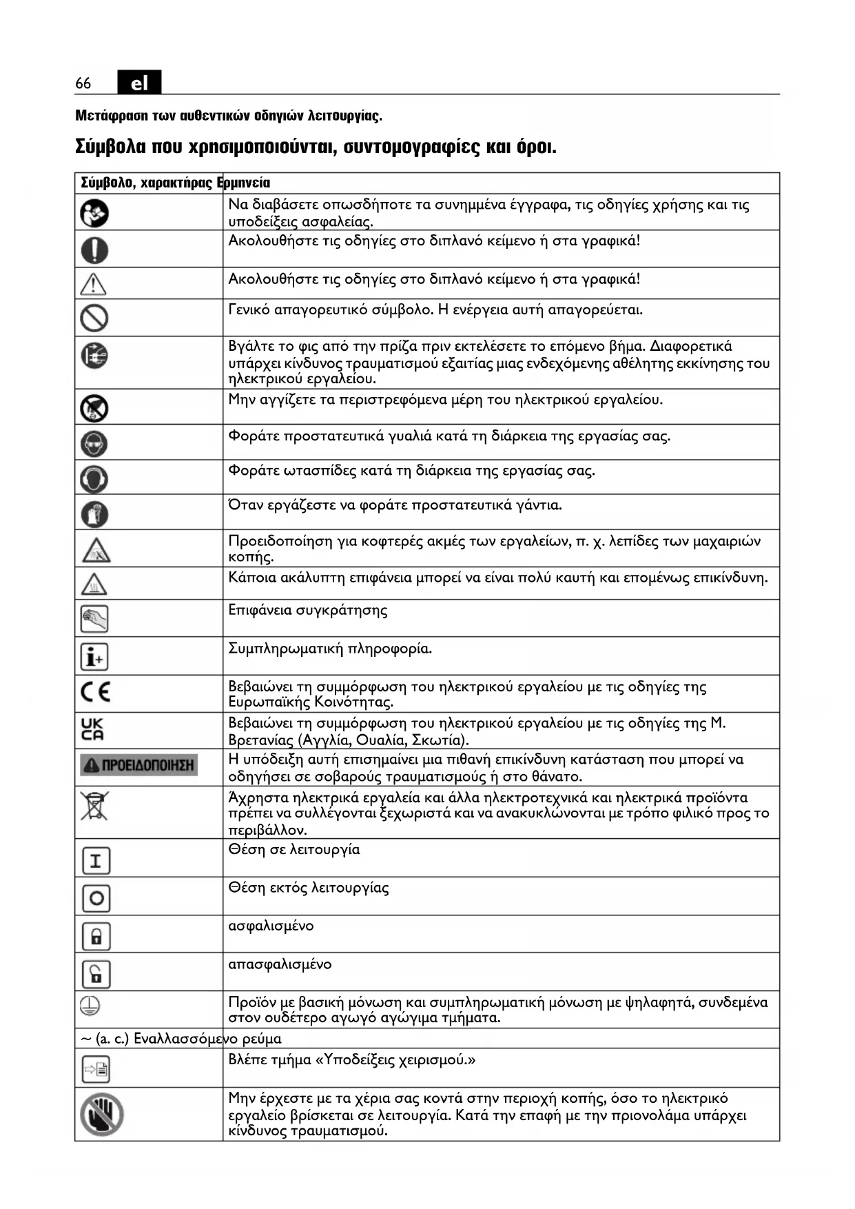 Κάποια ακάλυπτη επιφάνεια μπορεί να είναι πολύ καυτή και επομένως επικίνδυνη. Επιφάνεια συγκράτησης Συμπληρωματική πληροφορία. Βεβαιώνει τη συμμόρφωση του ηλεκτρικού εργαλείου με τις οδηγίες της Ευρωπαϊκής Κοινότητας. Βεβαιώνει τη συμμόρφωση του ηλεκτρικού εργαλείου με τις οδηγίες της Μ. Βρετανίας (Αγγλία, Ουαλία, Σκωτία). Η υπόδειξη αυτή επισημαίνει μια πιθανή επικίνδυνη κατάσταση που μπορεί να οδηγήσει σε σοβαρούς τραυματισμούς ή στο θάνατο. Άχρηστα ηλεκτρικά εργαλεία και άλλα ηλεκτροτεχνικά και ηλεκτρικά προϊόντα πρέπει να συλλέγονται ξεχωριστά και να ανακυκλώνονται με τρόπο φιλικό προς το περιβάλλον. Θέση σε λειτουργία Θέση εκτός λειτουργίας ασφαλισμένο απασφαλισμένο Προϊόν με βασική μόνωση και συμπληρωματική μόνωση με ψηλαφητά, συνδεμένα στον ουδέτερο αγωγό αγώγιμα τμήματα. ~ (a. c.) Εναλλασσόμενο ρεύμα Βλέπε τμήμα «Υποδείξεις χειρισμού.» Μην έρχεστε με τα χέρια σας κοντά στην περιοχή κοπής, όσο το ηλεκτρικό εργαλείο βρίσκεται σε λειτουργία. Κατά την επαφή με την πριονολάμα υπάρχει κίνδυνος τραυματισμού.67