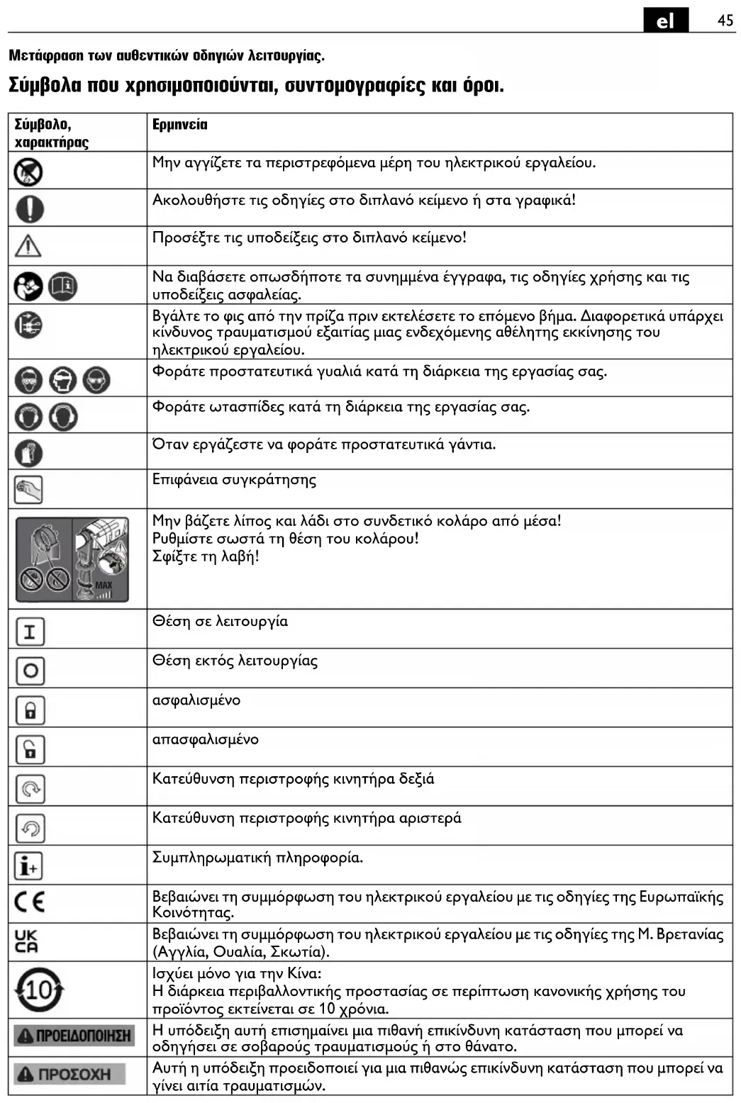 Μην αγγίζετε τα περιστρεφόμενα μέρη του ηλεκτρικού εργαλείου. Ακολουθήστε τις οδηγίες στο διπλανό κείμενο ή στα γραφικά! Προσέξτε τις υποδείξεις στο διπλανό κείμενο! Να διαβάσετε οπωσδήποτε τα συνημμένα έγγραφα, τις οδηγίες χρήσης και τις υποδείξεις ασφαλείας. Βγάλτε το φις από την πρίζα πριν εκτελέσετε το επόμενο βήμα. Διαφορετικά υπάρχει κίνδυνος τραυματισμού εξαιτίας μιας ενδεχόμενης αθέλητης εκκίνησης του ηλεκτρικού εργαλείου. Φοράτε προστατευτικά γυαλιά κατά τη διάρκεια της εργασίας σας. Φοράτε ωτασπίδες κατά τη διάρκεια της εργασίας σας. Όταν εργάζεστε να φοράτε προστατευτικά γάντια. Επιφάνεια συγκράτησης Μην βάζετε λίπος και λάδι στο συνδετικό κολάρο από μέσα! Ρυθμίστε σωστά τη θέση του κολάρου! Σφίξτε τη λαβή! Θέση σε λειτουργία Θέση εκτός λειτουργίας ασφαλισμένο απασφαλισμένο Κατεύθυνση περιστροφής κινητήρα δεξιά Κατεύθυνση περιστροφής κινητήρα αριστερά Συμπληρωματική πληροφορία. Βεβαιώνει τη συμμόρφωση του ηλεκτρικού εργαλείου με τις οδηγίες της Ευρωπαϊκής Κοινότητας. Βεβαιώνει τη συμμόρφωση του ηλεκτρικού εργαλείου με τις οδηγίες της Μ. Βρετανίας (Αγγλία, Ουαλία, Σκωτία). Ισχύει μόνο για την Κίνα: Η διάρκεια περιβαλλοντικής προστασίας σε περίπτωση κανονικής χρήσης του προϊόντος εκτείνεται σε 10 χρόνια. Η υπόδειξη αυτή επισημαίνει μια πιθανή επικίνδυνη κατάσταση που μπορεί να οδηγήσει σε σοβαρούς τραυματισμούς ή στο θάνατο. Αυτή η υπόδειξη προειδοποιεί για μια πιθανώς επικίνδυνη κατάσταση που μπορεί να γίνει αιτία τραυματισμών. MAX46