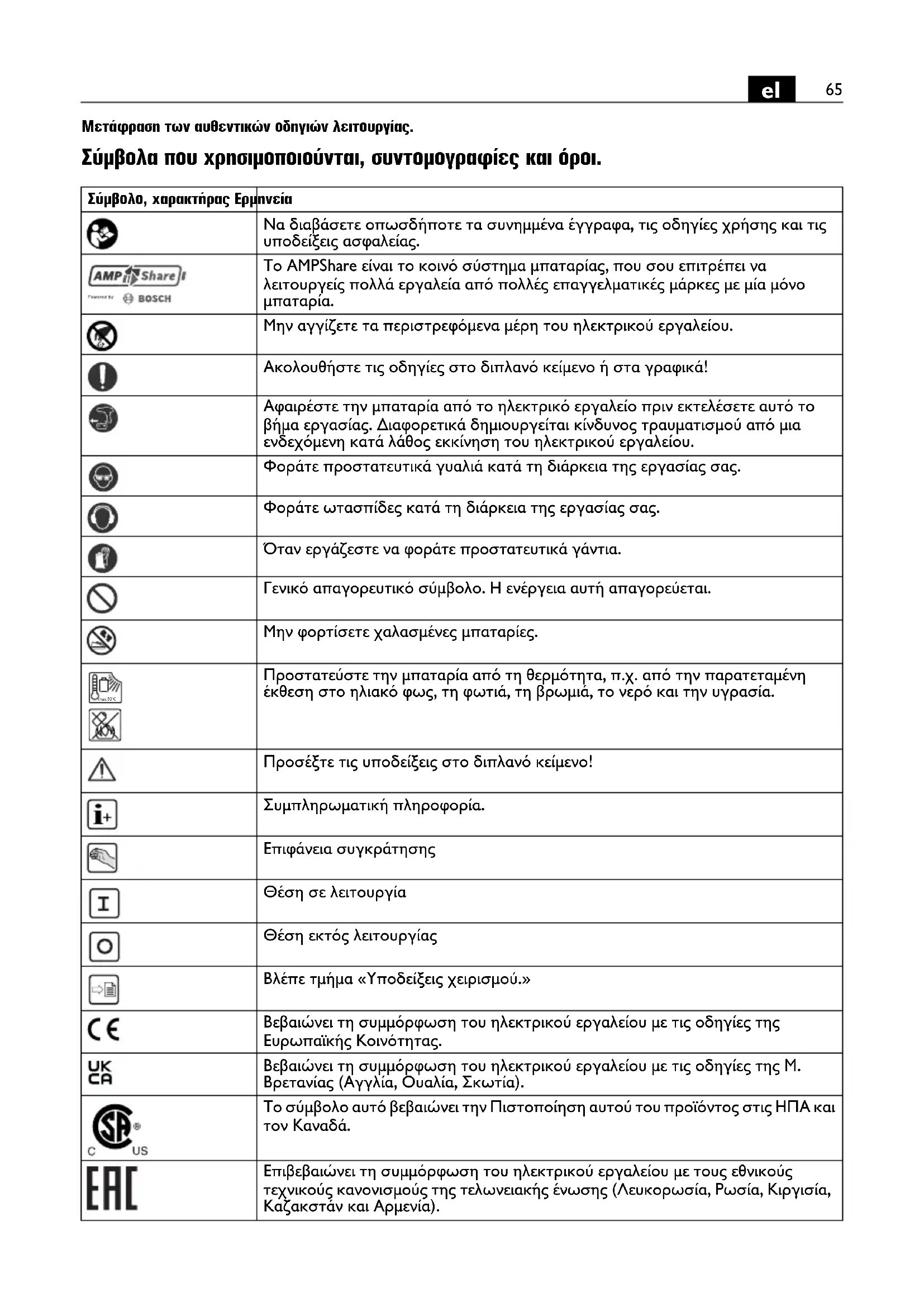 Μην αγγίζετε τα περιστρεφόμενα μέρη του ηλεκτρικού εργαλείου. Ακολουθήστε τις οδηγίες στο διπλανό κείμενο ή στα γραφικά! Αφαιρέστε την μπαταρία από το ηλεκτρικό εργαλείο πριν εκτελέσετε αυτό το βήμα εργασίας. Διαφορετικά δημιουργείται κίνδυνος τραυματισμού από μια ενδεχόμενη κατά λάθος εκκίνηση του ηλεκτρικού εργαλείου. Φοράτε προστατευτικά γυαλιά κατά τη διάρκεια της εργασίας σας. Φοράτε ωτασπίδες κατά τη διάρκεια της εργασίας σας. Όταν εργάζεστε να φοράτε προστατευτικά γάντια. Γενικό απαγορευτικό σύμβολο. Η ενέργεια αυτή απαγορεύεται. Μην φορτίσετε χαλασμένες μπαταρίες. Προστατεύστε την μπαταρία από τη θερμότητα, π.χ. από την παρατεταμένη έκθεση στο ηλιακό φως, τη φωτιά, τη βρωμιά, το νερό και την υγρασία. Προσέξτε τις υποδείξεις στο διπλανό κείμενο! Συμπληρωματική πληροφορία. Επιφάνεια συγκράτησης Θέση σε λειτουργία Θέση εκτός λειτουργίας Βλέπε τμήμα «Υποδείξεις χειρισμού.» Βεβαιώνει τη συμμόρφωση του ηλεκτρικού εργαλείου με τις οδηγίες της Ευρωπαϊκής Κοινότητας. Βεβαιώνει τη συμμόρφωση του ηλεκτρικού εργαλείου με τις οδηγίες της Μ. Βρετανίας (Αγγλία, Ουαλία, Σκωτία). Το σύμβολο αυτό βεβαιώνει την Πιστοποίηση αυτού του προϊόντος στις ΗΠΑ και τον Καναδά. Επιβεβαιώνει τη συμμόρφωση του ηλεκτρικού εργαλείου με τους εθνικούς τεχνικούς κανονισμούς της τελωνειακής ένωσης (Λευκορωσία, Ρωσία, Κιργισία, Καζακστάν και Αρμενία). max.50°C66