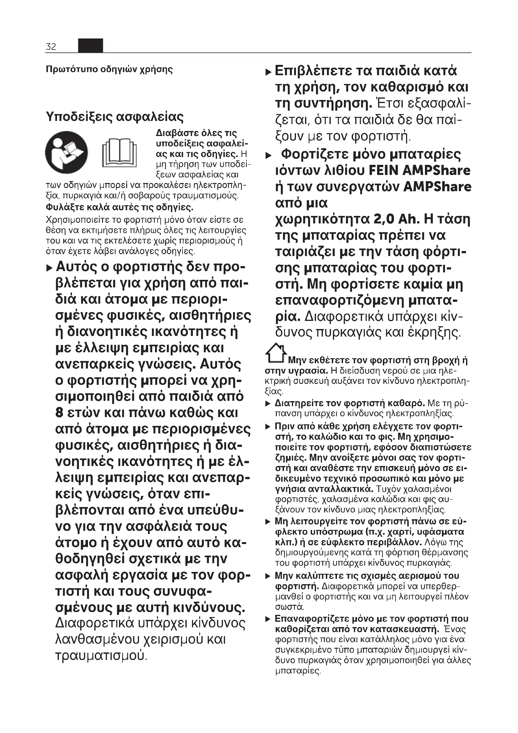 Ελέγξτε την τάση του δικτύου, αναθέστε εν- δεχομένως τον έλεγχο του φορτιστή σε ένα εξουσιοδοτημένο κέντρο σέρβις για ηλε- κτρικά εργαλεία FEIN Υποδείξεις εργασίαςΕλληνικά Ένας σημαντικά μειωμένος χρόνος λειτουργίας μετά τη φόρτιση σημαίνει ότι η μπαταρία εξα- ντλήθηκε και πρέπει να αντικατασταθεί. Σε περιπτώσεις διαρκούς φόρτισης ή αλλεπάλλη- λων, χωρίς διακοπή κύκλων φόρτισης, ο φορτι- στής μπορεί να ζεσταθεί. Αυτό όμως είναι ακίν- δυνο και δεν υποδεικνύει τεχνικό ελάττωμα του