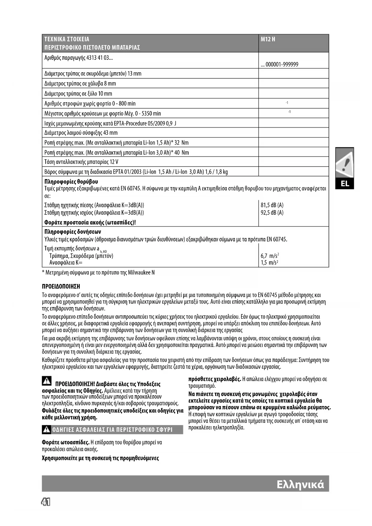 - Μετρημένη σύμφωνα με το πρότυπο της Milwaukee N ΠΡΟEIΔΟΠΟIΗΣΗ Το αναφερόμενο σ’ αυτές τις οδηγίες επίπεδο δονήσεων έχει μετρηθεί με μια τυποποιημένη σύμφωνα με το EN 60745 μέθοδο μέτρησης και μπορεί να χρησιμοποιηθεί για τη σύγκριση των ηλεκτρικών εργαλείων μεταξύ τους. Αυτό είναι επίσης κατάλληλο για μια προσωρινή εκτίμηση της επιβάρυνση των δονήσεων. Το αναφερόμενο επίπεδο δονήσεων αντιπροσωπεύει τις κύριες χρήσεις του ηλεκτρικού εργαλείου. Εάν όμως το ηλεκτρικό χρησιμοποιείται σε άλλες χρήσεις, με διαφορετικά εργαλεία εφαρμογής ή ανεπαρκή συντήρηση, μπορεί να υπάρξει απόκλιση του επιπέδου δονήσεων. Αυτό μπορεί να αυξήσει σημαντικά την επιβάρυνση των δονήσεων για τη συνολική διάρκεια της εργασίας Για μια ακριβή εκτίμηση της επιβάρυνσης των δονήσεων οφείλουν επίσης να λαμβάνονται υπόψη οι χρόνοι, στους οποίους η συσκευή είναι απενεργοποιημένη ή είναι μεν ενεργοποιημένη αλλά δεν χρησιμοποιείται πραγματικά. Αυτό μπορεί να μειώσει σημαντικά την επιβάρυνση των δονήσεων για τη συνολική διάρκεια της εργασίας. Καθορίζετε πρόσθετα μέτρα ασφαλείας για την προστασία του χειριστή από την επίδραση των δονήσεων όπως για παράδειγμα: Συντήρηση του ηλεκτρικού εργαλείου και των εργαλείων εφαρμογής, διατηρείτε ζεστά τα χέρια, οργάνωση των διαδικασιών εργασίας.42