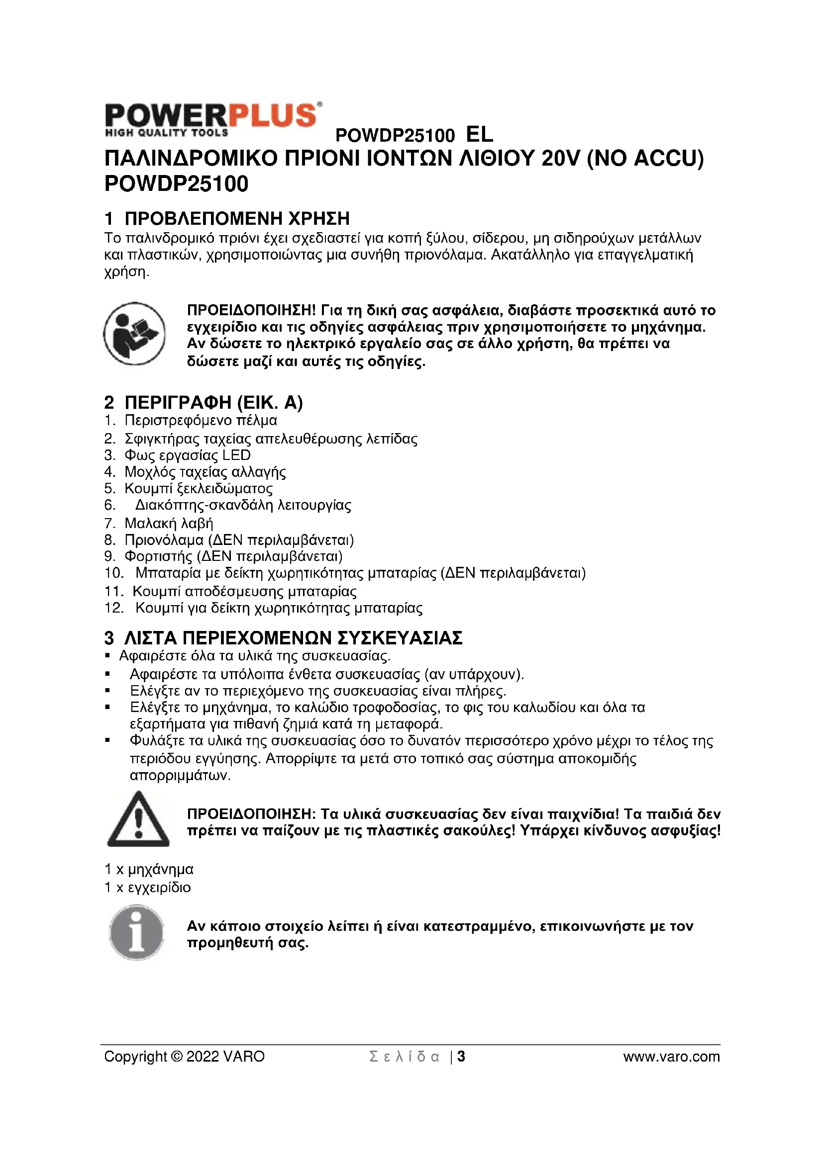 - Αφαιρέστε την μπαταρία και την πριονόλαμα.POWDP25100 EL Copyright © 2022 VARO Σ ε λ ί δ α | 11 www.varo.com