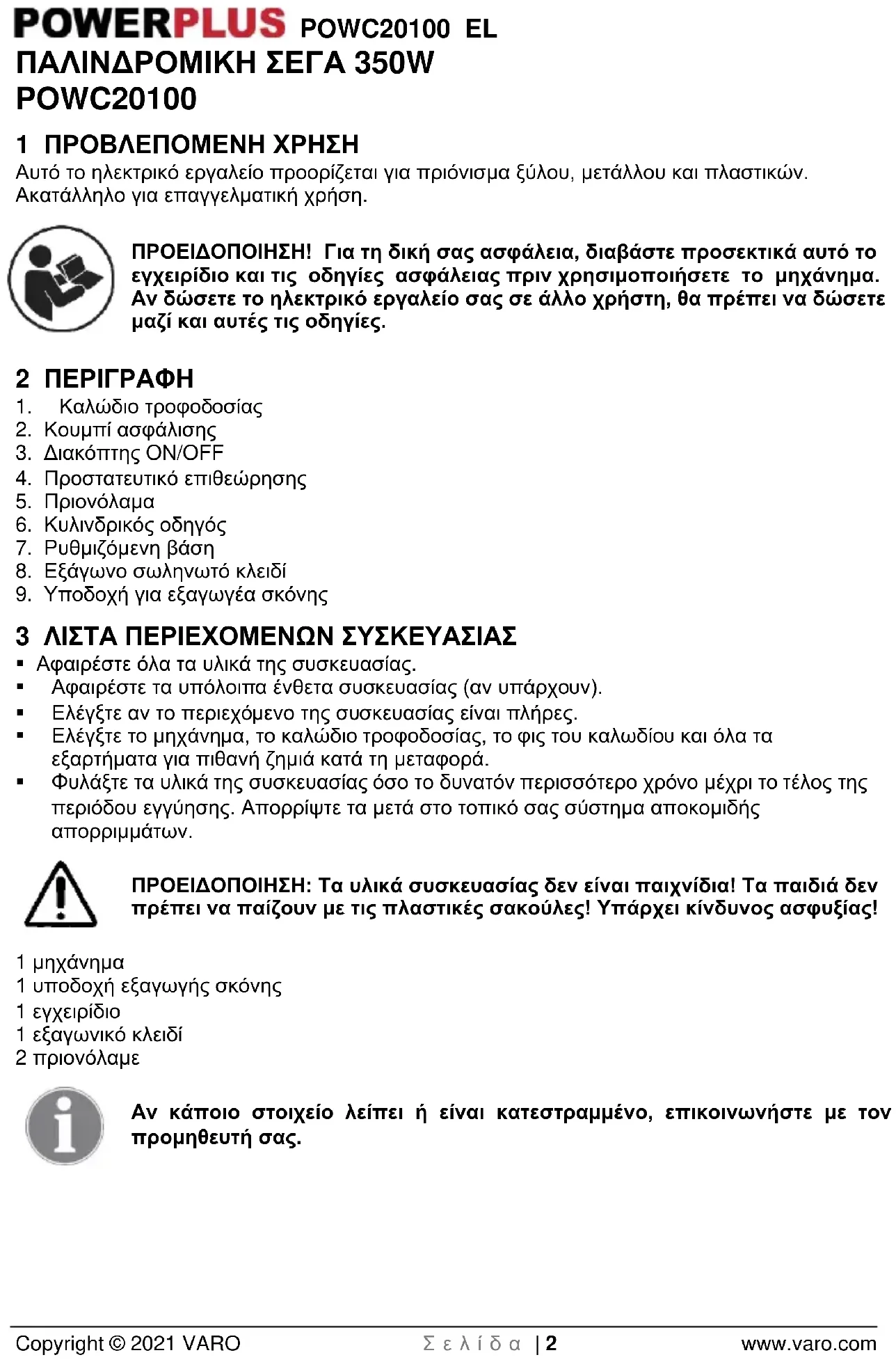 - 12 ΔΗΛΩΣΗ ΣΥΜΜΟΡΦΩΣΗΣ POWC20100 EL Copyright © 2021 VARO Σ ε λ ί δ α | 2 www.varo.com ΠΑΛΙΝΔΡΟΜΙΚΗ ΣΕΓΑ 350W POWC20100 1 ΠΡΟΒΛΕΠΟΜΕΝΗ ΧΡΗΣΗ Αυτό το ηλεκτρικό εργαλείο προορίζεται για πριόνισμα ξύλου, μετάλλου και πλαστικών. Ακατάλληλο για επαγγελματική χρήση. ΠΡΟΕΙΔΟΠΟΙΗΣΗ! Για τη δική σας ασφάλεια, διαβάστε προσεκτικά αυτό το εγχειρίδιο και τις οδηγίες ασφάλειας πριν χρησιμοποιήσετε το μηχάνημα. Αν δώσετε το ηλεκτρικό εργαλείο σας σε άλλο χρήστη, θα πρέπει να δώσετε μαζί και αυτές τις οδηγίες. 2 ΠΕΡΙΓΡΑΦΗ p. 8