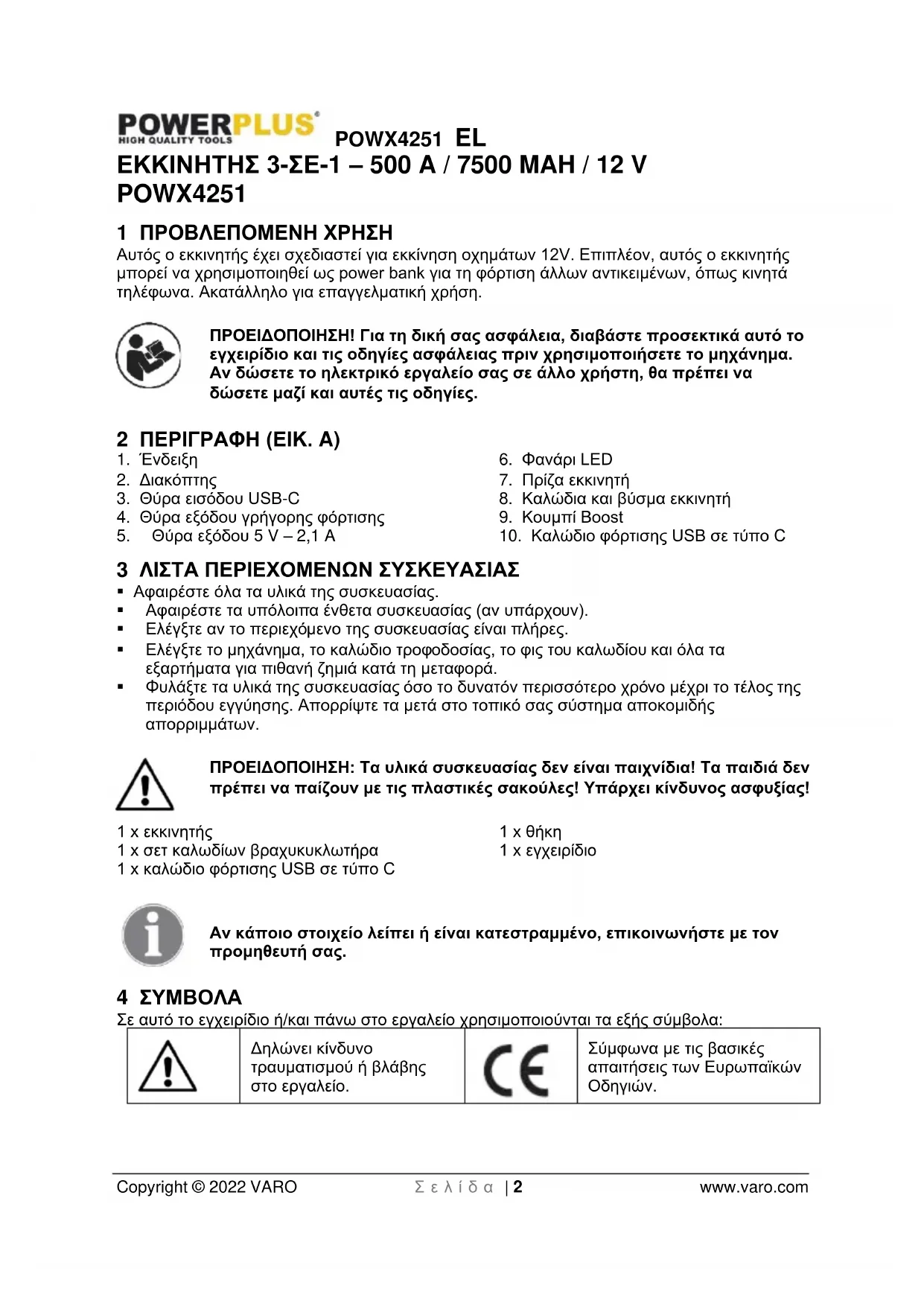 Σύμφωνα με τις βασικές απαιτήσεις των Ευρωπαϊκών Οδηγιών.POWX4251 EL Copyright © 2022 VARO Σ ε λ ί δ α | 3 www.varo.com