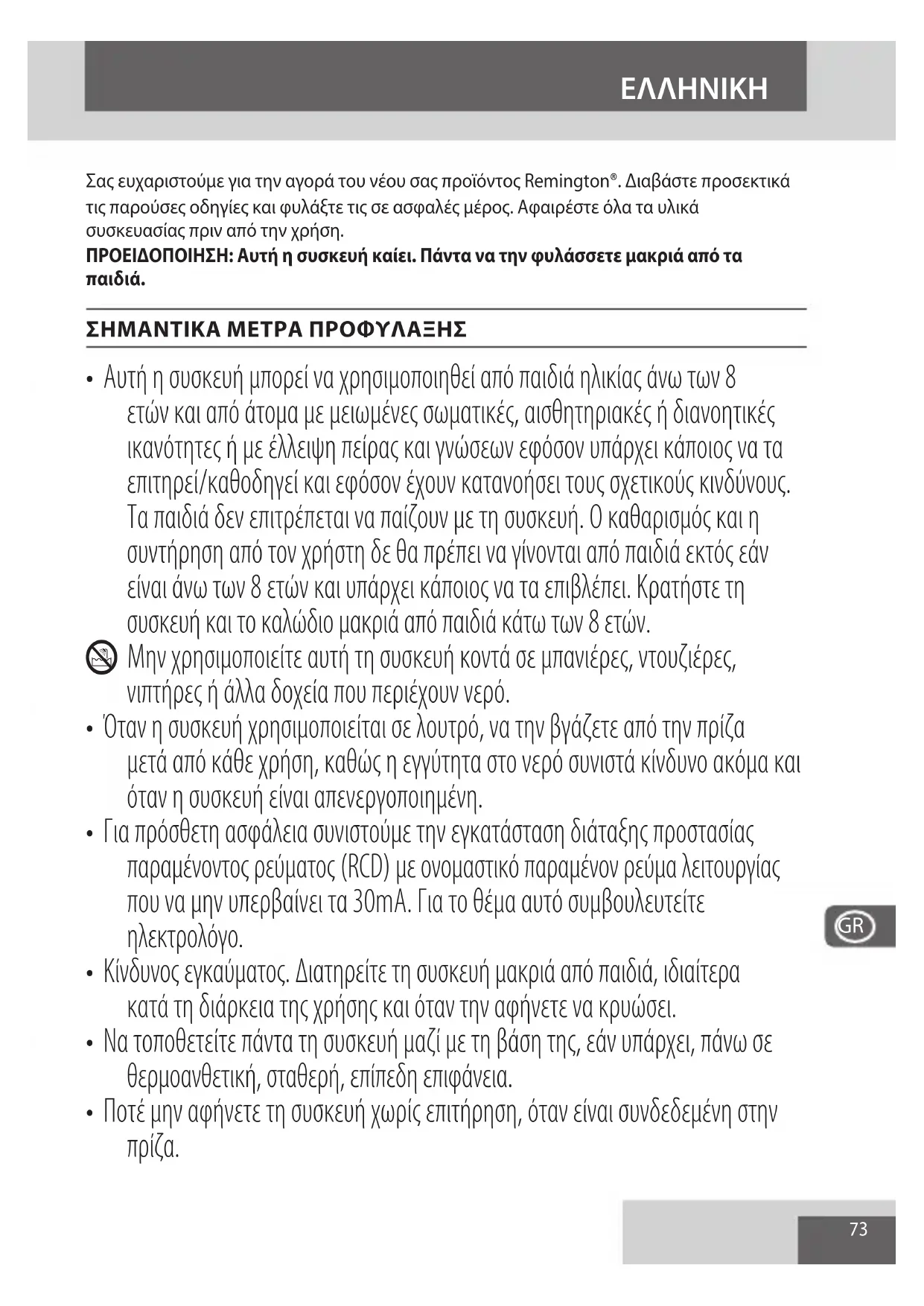 Για την αποφυγή προβλημάτων στο περιβάλλον και την υγεία λόγω επιβλαβών ουσιών, οι συσκευές και οι επαναφορτιζόμενες και μη επαναφορτιζόμενες μπαταρίες που επισημαίνονται με κάποιο από αυτά τα σύμβολα, δεν πρέπει να απορρίπτονται με τα κοινά οικιακά απορρίμματα. Να απορρίπτετε πάντα τις ηλεκτρικές και ηλεκτρονικές συσκευές και, όπου χρειάζεται, τις επαναφορτιζόμενες και μη επαναφορτιζόμενες μπαταρίες, σε κατάλληλο, επίσημο σημείο συλλογής/ανακύκλωσης.77 Zahvaljujemo se vam za nakup novega izdelka Remington®. Prosimo, da skrbno preberete ta navodila in jih varno shranite. Pred uporabo odstranite vso embalažo. OPOZORILO: Ta naprava je vroča. Vedno naj bo nedosegljiva otrokom.