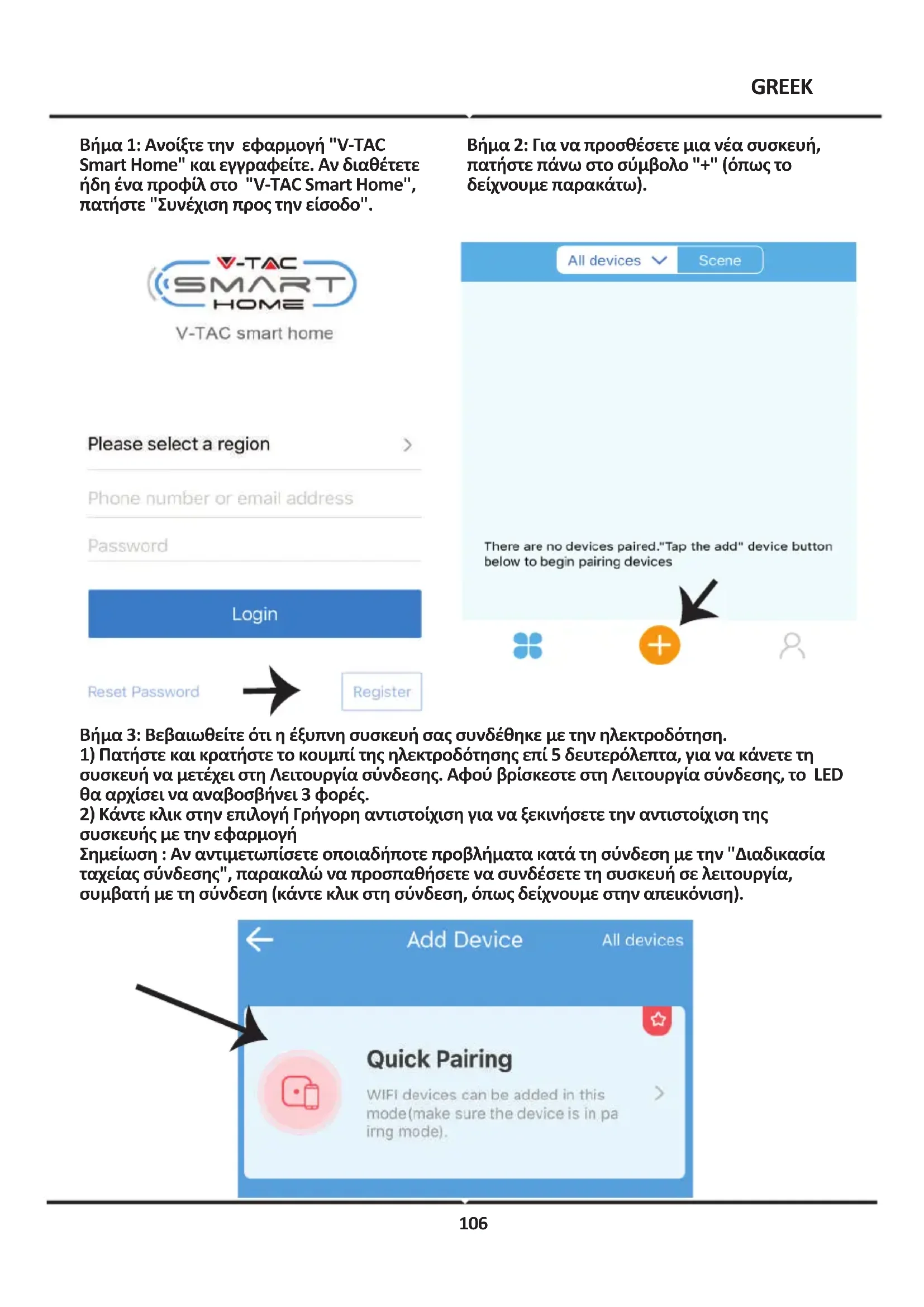 συσκευής με την εφαρμογή Σημείωση : Αν αντιμετωπίσετε οποιαδήποτε προβλήματα κατά τη σύνδεση με την "Διαδικασία ταχείας σύνδεσης", παρακαλώ να προσπαθήσετε να συνδέσετε τη συσκευή σε λειτουργία, συμβατή με τη σύνδεση (κάντε κλικ στη σύνδεση, όπως δείχνουμε στην απεικόνιση). 106Βήμα 5: Ονομάστε τη συσκευή σας (για παράδειγμα: Smart Plug / Smart Switch) και κάντε κλικ στην επιλογή Ολοκλήρωση. GREEK Βήμα 4: Επιλέξτε το όνομα του δικού σας Wi-Fi, εισάγετε την παρόλα και πιέστε "Επόμενο". Βήμα 6: Η συσκευή σας συνδέθηκε και θα φαίνεται (π.χ.: όπως φαίνεται στην απεικόνιση