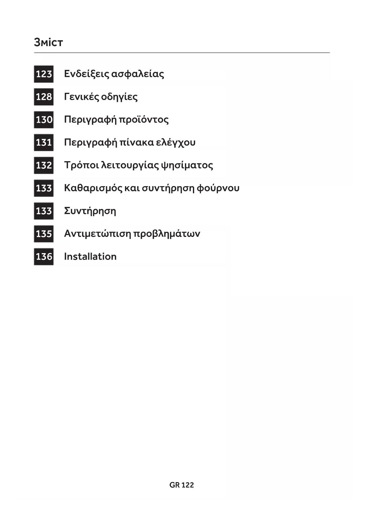 - Για την πιο σωστή χρήση του φούρνου, καλό είναι να μην έρχονται τα τρόφιμα σε άμεση επαφή με τις σχάρες και τους δίσκους, αλλά να χρησιμοποιείτε τα ειδικά αντικολλητικά χαρτιά φούρνου ή/και ειδικά δοχεία.GR 128 Γενικές οδηγίες Ενδείξεις ασφαλείας Σας ευχαριστούμε που επιλέξατε ένα από τα προϊόντα μας. Για να έχετε τα καλύτερα αποτελέσματα με τον φούρνο σας, θα πρέπει να διαβάσετε προσεκτικά αυτό το εγχειρίδιο οδηγιών χρήσης και να το φυλάξετε για μελλοντική αναφορά. Πριν τοποθετήσετε τον φούρνο, σημειώστε τον σειριακό αριθμό έτσι ώστε να μπορείτε να τον δώσετε στο προσωπικό της υπηρεσίας εξυπηρέτησης πελατών εάν πρέπει να γίνει μία επισκευή. Αφού έχετε αφαιρέσει τον φούρνο από την συσκευασία του, ελέγξτε ότι δεν έχει πάθει ζημιά κατά την διάρκεια της μεταφοράς. Εάν έχετε οποιαδήποτε αμφιβολία, μην χρησιμοποιήσετε τον φούρνο και επικοινωνήστε με ένα πιστοποιημένο τεχνικό για συμβουλές. Κρατήστε όλα τα υλικά της συσκευασίας (πλαστικές σακούλες, πολυστερίνες, καρφιά) μακριά από παιδιά. Όταν ανάβει ο φούρνος για πρώτη φορά, μπορεί να εμφανιστεί έντονος καπνός μαζί με μυρωδιά, ο οποίος προκαλείται από την κόλλα που υπάρχει επάνω στα μονωτικά πλαίσια που περιβάλουν τον φούρνο τα οποία θερμαίνονται για πρώτη φορά. Αυτό είναι απολύτως φυσιολογικό και, εάν εμφανιστεί, θα πρέπει να περιμένετε να διαλυθεί ο καπνός πριν τοποθετήσετε φαγητό μέσα στον φούρνο. Ο κατασκευαστής δεν φέρει καμία απολύτως ευθύνη σε περίπτωση που δεν τηρούνται οι οδηγίες που περιέχονται σε αυτό το έγγραφο. ΣΗΜΕΙΩΣΗ: οι λειτουργίες του φούρνου, οι ιδιότητες και τα αξεσουάρ που περιγράφονται σε αυτό το εγχειρίδιο θα διαφέρουν, ανάλογα με το μοντέλο που έχετε αγοράσει. Використовуйте духовку лише за призначенням, а саме для приготування їжі. Будь-яке інше використання, наприклад, як джерела тепла, є неправильним та відповідно небезпечним. Виробник не несе відповідальності за будь-яку шкоду заподіяну внаслідок неправильного, невідповідного чи нерозумного використання приладу. Використання будь-якого електричного приладу передбачає дотримання деяких фундаментальних правил: - не тягніть кабель живлення, щоб витягнути вилку з розетки; - не торкайтеся приладу вологими чи мокрими руками або ногами; - як правило, не рекомендується використовувати адаптери, розгалужувачі та продовжувачі; у випадку несправності та/чи невідповідної роботи, вимкніть прилад і не намагайтеся відремонтувати його. Ηλεκτρική ασφάλεια ΣΙΓΟΥΡΕΥΤΕΙΤΕ ΟΤΙ ΟΛΕΣ ΟΙ ΗΛΕΚΤΡΙΚΕΣ ΣΥΝΔΕΣΕΙΣ ΓΙΝΟΝΤΑΙ ΑΠΟ ΕΝΑ ΗΛΕΚΤΡΟΛΟΓΟ Ή ΠΙΣΤΟΠΟΙΗΜΕΝΟ ΤΕΧΝΙΚΟ. Το καλώδιο τροφοδοσίας με το οποίο συνδέεται ο φούρνος πρέπει να πληροί τις προϋποθέσεις της ισχύουσας νομοθεσίας στην χώρα τοποθέτησης. Ο κατασκευαστής δεν φέρει καμία απολύτως ευθύνη για τυχόν ζημιά που έχει προκληθεί από μη τήρηση αυτών των οδηγιών. Ο φούρνος πρέπει να είναι συνδεδεμένος σε μία παροχή ηλεκτρικού ρεύματος με γειωμένη πρίζα τοίχου ή ένα πολλαπλό ασφαλειοδιακόπτη, ανάλογα με την ισχύουσα νομοθεσία στην χώρα τοποθέτησης. Η τροφοδοσία του ηλεκτρικού ρεύματος θα πρέπει να προστατεύεται με κατάλληλες ασφάλειες και τα καλώδια που χρησιμοποιούνται πρέπει να έχουν διατομή η οποία να εγγυάται την σωστή τροφοδοσία του φούρνου.