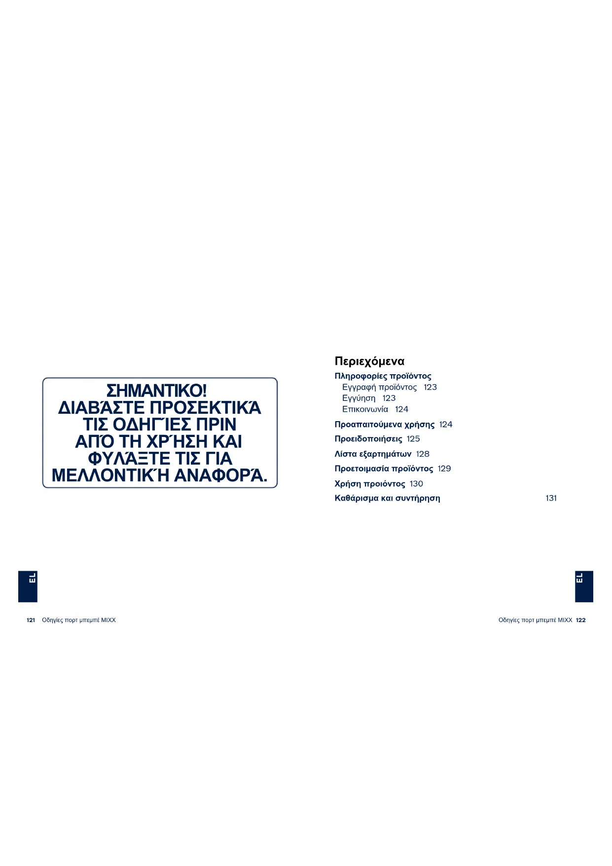ΔΙΑΒΆΣΤΕ ΠΡΟΣΕΚΤΙΚΆ ΤΙΣ ΟΔΗΓΊΕΣ ΠΡΙΝ ΑΠΌ ΤΗ ΧΡΉΣΗ ΚΑΙ ΦΥΛΆΞΤΕ ΤΙΣ ΓΙΑ ΜΕΛΛΟΝΤΙΚΉ ΑΝΑΦΟΡΆ. Περιεχόμενα Πληροφορίες προϊόντος Εγγραφή προϊόντος 123 Εγγύηση 123 Επικοινωνία 124 Προαπαιτούμενα χρήσης 124 Προειδοποιήσεις 125 Λίστα εξαρτημάτων 128 Προετοιμασία προϊόντος 129 Χρήση προιόντος 130 Καθάρισμα και συντήρηση 131Οδηγίες πορτ μπεμπέ MIXX
