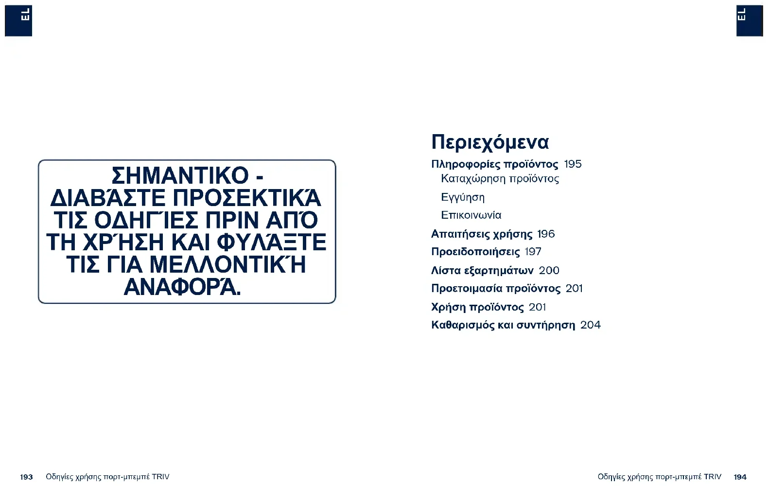 Επικοινωνία Απαιτήσεις χρήσης 196 Προειδοποιήσεις 197 Λίστα εξαρτημάτων 200 Προετοιμασία προϊόντος 201 Χρήση προϊόντος 201 Καθαρισμός και συντήρηση 204 ΣΗΜΑΝΤΙΚΟ - ΔΙΑΒΆΣΤΕ ΠΡΟΣΕΚΤΙΚΆ ΤΙΣ ΟΔΗΓΊΕΣ ΠΡΙΝ ΑΠΌ ΤΗ ΧΡΉΣΗ ΚΑΙ ΦΥΛΆΞΤΕ ΤΙΣ ΓΙΑ ΜΕΛΛΟΝΤΙΚΉ ΑΝΑΦΟΡΆ.195 Οδηγίες χρήσης πορτ-μπεμπέ TRIV