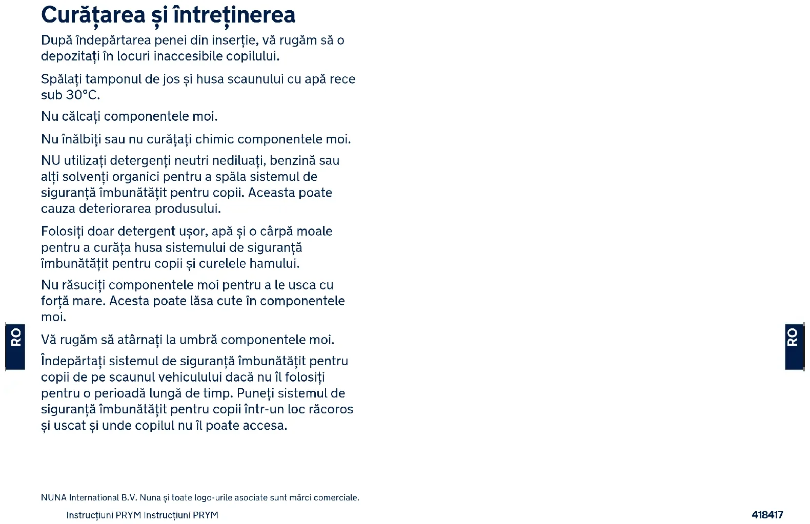 Αφού αφαιρέσετε τη σφήνα από το ένθετο, παρακαλούμε αποθηκεύστε την σε σημείο όπου δεν έχει πρόσβαση το παιδί. Πλένετε το κάτω μαξιλάρι καθίσματος και το πάνω μέρος του καλύμματος του καθίσματος με κρύο νερό, σε θερμοκρασία κάτω των 30°C. Μη σιδερώνετε τα υφασμάτινα στοιχεία. Μη χρησιμοποιείτε λευκαντικό ή υποβάλετε σε στεγνό καθάρισμα τα υφασμάτινα στοιχεία. Μη χρησιμοποιείτε αδιάλυτα απορρυπαντικά, βενζίνη ή άλλους οργανικούς διαλύτες για να πλύνετε το ενισχυμένο παιδικό κάθισμα ασφαλείας. Ενδέχεται να προκαλέσουν φθορά στο προϊόν. Χρησιμοποιείτε μόνο ήπιο απορρυπαντικό, νερό και ένα μαλακό πανί για να καθαρίσετε το περίβλημα του ενισχυμένου παιδικού καθίσματος ασφαλείας και τις τιράντες των ιμάντων. Μη στρίβετε με μεγάλη δύναμη τα υφασμάτινα στοιχεία για να στεγνώσουν. Μπορεί να προκληθούν ζάρες στα υφασμάτινα στοιχεία. Κρεμάστε στη σκιά τα υφασμάτινα στοιχεία για να στεγνώσουν. Αφαιρέστε το ενισχυμένο παιδικό κάθισμα ασφαλείας από το κάθισμα του οχήματος αν δεν πρόκειται να χρησιμοποιηθεί για μεγάλο χρονικό διάστημα. Τοποθετήστε το ενισχυμένο παιδικό κάθισμα ασφαλείας σε δροσερό, ξηρό χώρο και σε σημείο στο οποίο δεν έχει πρόσβαση το παιδί σας. NUNA International B.V. Το λογότυπο Nuna και όλα τα σχετιζόμενα λογότυπα είναι εμπορικά σήματα.444443 PRYM talimatı PRYM talimatı