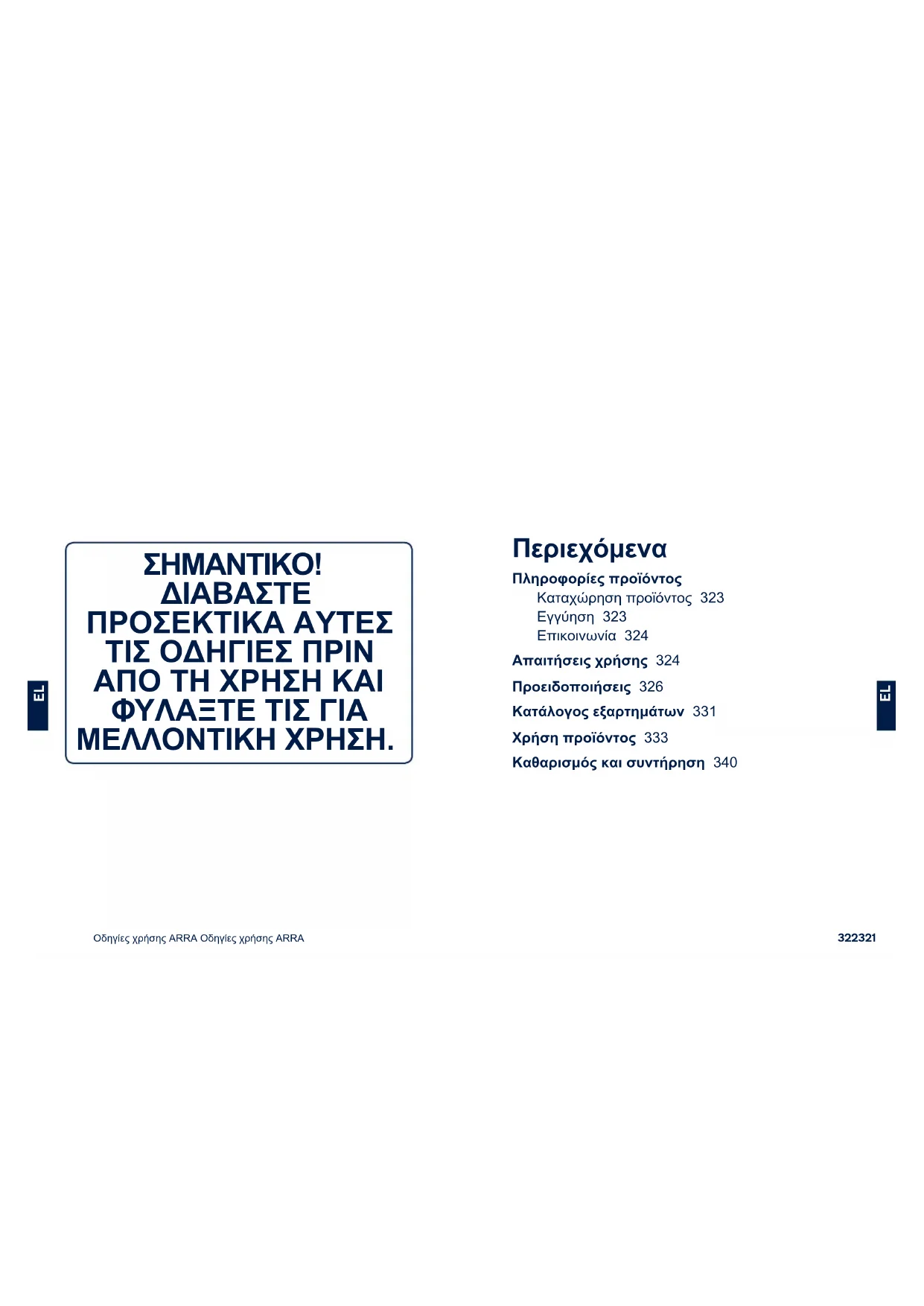 Οδηγίες χρήσης ARRA Οδηγίες χρήσης ARRA Περιεχόμενα Πληροφορίες προϊόντος Καταχώρηση προϊόντος 323 Εγγύηση 323 Επικοινωνία 324 Απαιτήσεις χρήσης 324 Προειδοποιήσεις 326 Κατάλογος εξαρτημάτων 331 Χρήση προϊόντος 333 Καθαρισμός και συντήρηση 340