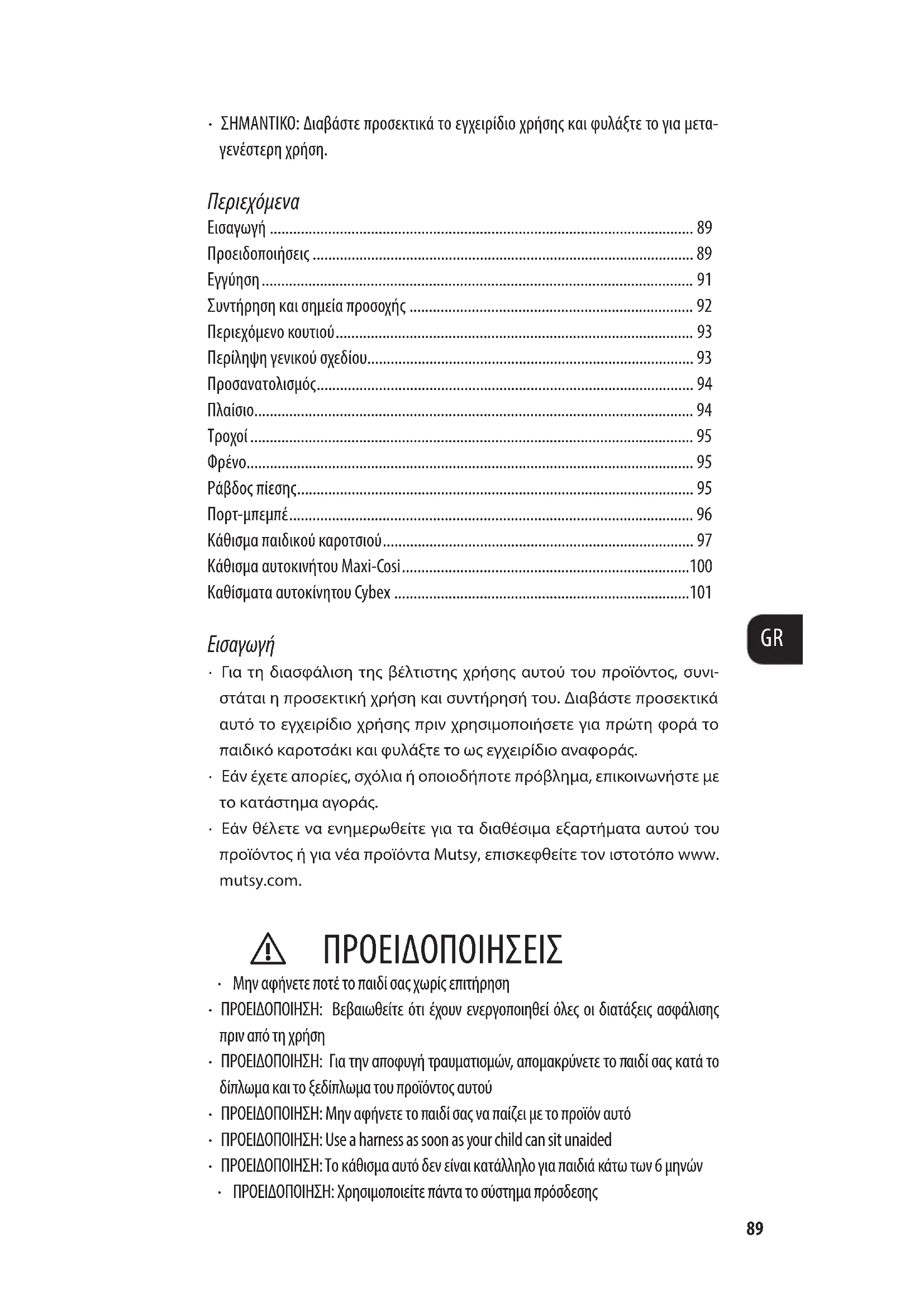 - Εάν θέλετε να ενημερωθείτε για τα διαθέσιμα εξαρτήματα αυτού του προϊόντος ή για νέα προϊόντα Mutsy, επισκεφθείτε τον ιστοτόπο www. mutsy.com. ⚠ ΠΡΟΕΙΔΟΠΟΙΗΣΕΙΣ