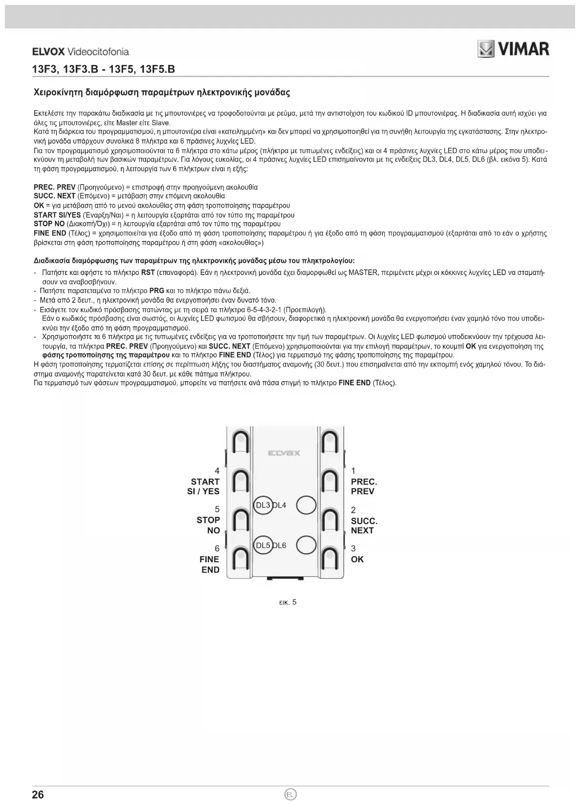 κνύουν τη μεταβολή των βασικών παραμέτρων. Για λόγους ευκολίας, οι 4 πράσινες λυχνίες LED επισημαίνονται με τις ενδείξεις DL3, DL4, DL5, DL6 (βλ. εικόνα 5). Κατά τη φάση προγραμματισμού, η λειτουργία των 6 πλήκτρων είναι η εξής: PREC. PREV (Προηγούμενο) = επιστροφή στην προηγούμενη ακολουθία SUCC. NEXT (Επόμενο) = μετάβαση στην επόμενη ακολουθία OK = για μετάβαση από το μενού ακολουθίας στη φάση τροποποίησης παραμέτρου START SI/YES (Έναρξη/Ναι) = η λειτουργία εξαρτάται από τον τύπο της παραμέτρου STOP NO (Διακοπή/Όχι) = η λειτουργία εξαρτάται από τον τύπο της παραμέτρου FINE END (Τέλος) = χρησιμοποιείται για έξοδο από τη φάση τροποποίησης παραμέτρου ή για έξοδο από τη φάση προγραμματισμού (εξαρτάται από το εάν ο χρήστης βρίσκεται στη φάση τροποποίησης παραμέτρου ή στη φάση «ακολουθίας») Διαδικασία διαμόρφωσης των παραμέτρων της ηλεκτρονικής μονάδας μέσω του πληκτρολογίου: - Πατήστε και αφήστε το πλήκτρο RST (επαναφορά). Εάν η ηλεκτρονική μονάδα έχει διαμορφωθεί ως MASTER, περιμένετε μέχρι οι κόκκινες λυχνίες LED να σταματή