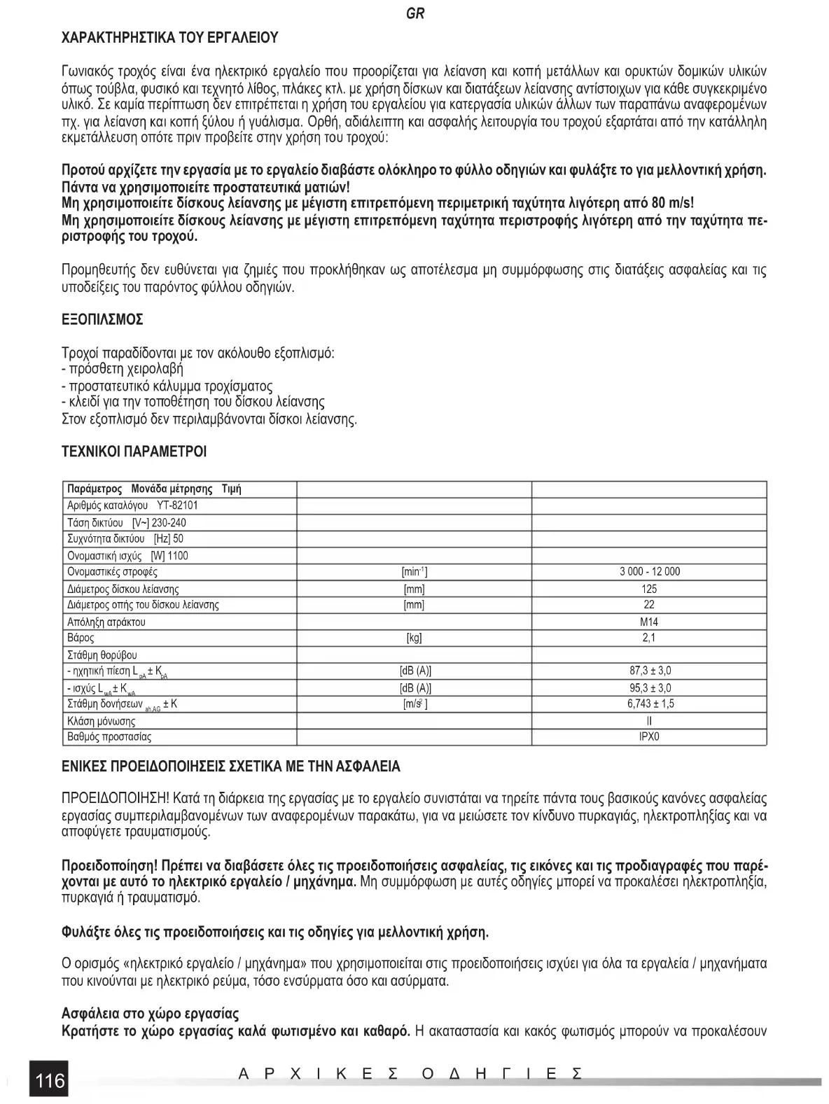 Τροχοί παραδίδονται με τον ακόλουθο εξοπλισμό: - πρόσθετη χειρολαβή - προστατευτικό κάλυμμα τροχίσματος - κλειδί για την τοποθέτηση του δίσκου λείανσης Στον εξοπλισμό δεν περιλαμβάνονται δίσκοι λείανσης. ΤΕΧΝΙΚΟΙ ΠΑΡΑΜΕΤΡΟΙ Παράμετρος Μονάδα μέτρησης Τιμή Αριθμός καταλόγου YT-82101 Τάση δικτύου [V~] 230-240 Συχνότητα δικτύου [Hz] 50 Ονομαστική ισχύς [W] 1100 Ονομαστικές στροφές [min