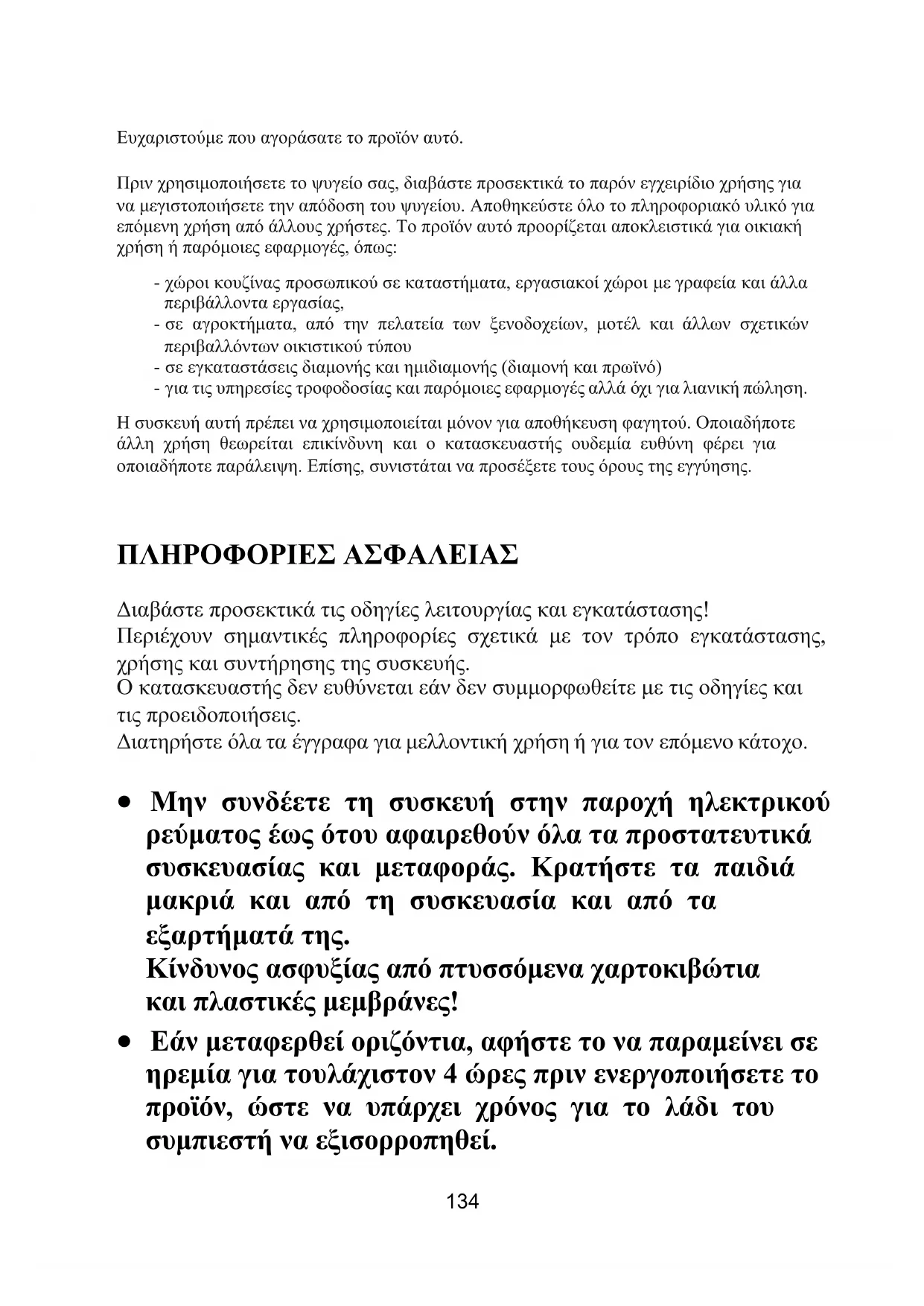 - Αντιμετώπιση προβλημάτων 133134 Ευχαριστούμε που αγοράσατε το προϊόν αυτό. Πριν χρησιμοποιήσετε το ψυγείο σας, διαβάστε προσεκτικά το παρόν εγχειρίδιο χρήσης για να μεγιστοποιήσετε την απόδοση του ψυγείου. Αποθηκεύστε όλο το πληροφοριακό υλικό για επόμενη χρήση από άλλους χρήστες. Το προϊόν αυτό προορίζεται αποκλειστικά για οικιακή χρήση ή παρόμοιες εφαρμογές, όπως: - χώροι κουζίνας προσωπικού σε καταστήματα, εργασιακοί χώροι με γραφεία και άλλα περιβάλλοντα εργασίας, - σε αγροκτήματα, από την πελατεία των ξενοδοχείων, μοτέλ και άλλων σχετικών περιβαλλόντων οικιστικού τύπου - σε εγκαταστάσεις διαμονής και ημιδιαμονής (διαμονή και πρωϊνό) - για τις υπηρεσίες τροφοδοσίας και παρόμοιες εφαρμογές αλλά όχι για λιανική πώληση. Η συσκευή αυτή πρέπει να χρησιμοποιείται μόνον για αποθήκευση φαγητού. Οποιαδήποτε άλλη χρήση θεωρείται επικίνδυνη και ο κατασκευαστής ουδεμία ευθύνη φέρει για οποιαδήποτε παράλειψη. Επίσης, συνιστάται να προσέξετε τους όρους της εγγύησης. ΠΛΗΡΟΦΟΡΙΕΣ ΑΣΦΑΛΕΙΑΣ Διαβάστε προσεκτικά τις οδηγίες λειτουργίας και εγκατάστασης! Περιέχουν σημαντικές πληροφορίες σχετικά με τον τρόπο εγκατάστασης, χρήσης και συντήρησης της συσκευής. Ο κατασκευαστής δεν ευθύνεται εάν δεν συμμορφωθείτε με τις οδηγίες και τις προειδοποιήσεις. Διατηρήστε όλα τα έγγραφα για μελλοντική χρήση ή για τον επόμενο κάτοχο. p. 156