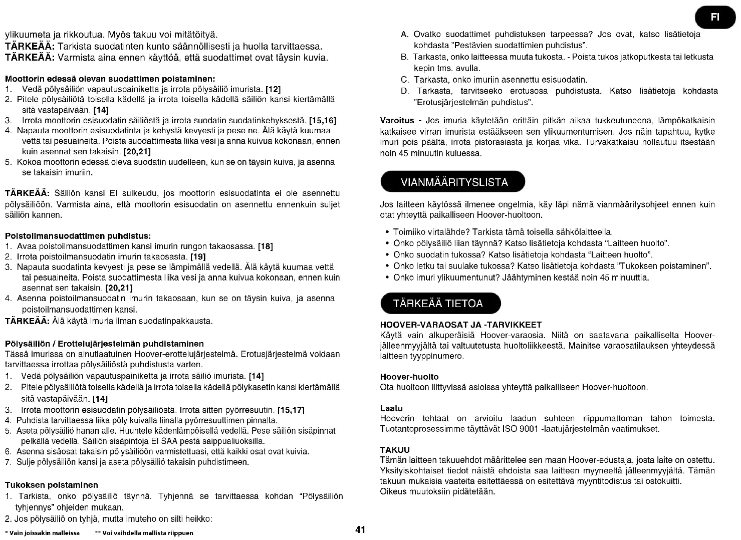 FI42 ΟΔΗΓΙΕΣ ΑΣΦΑΛΟΥΣ ΧΡΗΣΗΣ H συσκευή πρέπει να χρησιμοποιείται αποκλειστικά για οικιακή χρήση, σύμφωνα με τις οδηγίες χρήσης. Πριν δοκιμάσετε να χρησιμοποιήσετε τη συσκευή, βεβαιωθείτε ότι έχετε κατανοήσει τις οδηγίες που περιέχει ο οδηγός που κρατάτε στα χέρια σας. Μην αφήνετε τη συσκευή συνδεδεμένη στην πρίζα. Πριν τον καθαρισμό της συσκευής ή οποιασδήποτε εργασία συντήρησης, πρέπει να απενεργοποιείτε τη συσκευή και να την αποσυνδέετε από την πρίζα. Η χρήση της συσκευής από παιδιά άνω των 8 ετών, ηλικιωμένους και ΑΜεΑ προυποθέτει την παρουσία ενήλικα που θα φέρει την ευθύνη για την ασφαλειά τους.Η χρήση της συσκευής από άτομα που δεν έχουν εξοικειωθεί στη χρήση παρόμοιων συσκευών μπορεί να γίνει μόνο αφού γίνει κατανοητός ο κίνδυνος που ενέχει η χρήση της συσκευής. Μην αφήνετε τα παιδιά να παίζουν με τη συσκευή. Οι εργασίες καθαρισμού και συντήρησης της συσκευής δεν πρέπει να γίνονται από τα παιδιά χωρίς την επίβλεψη ενήλικα που θα φέρει την ευθύνη για την ασφάλειά τους. Εάν το καλώδιο σύνδεσης με το δίκτυο παροχής εμφανίσει φθορές διακόψτε την λειτουργία της συσκευής αμέσως. Για λόγους ασφάλειας η αντικατάσταση του φθαρμένου καλωδίου της συσκευής πρέπει να γίνεται αποκλειστικά στα σημεία τεχνικής υποστήριξης Hoover. Μην πλησιάζετε τις περιστρεφόμενες βούρτσες με τα χέρια, τα πόδια,τα μαλλιά ή τα ρούχα σας. Χρησιμοποιείτε αποκλειστικά γνήσια εξαρτήματα ,ανταλλακτικά και αναλώσιμα HOOVER. Στατικός ηλεκτρισμός: Ορισμένα χαλιά μπορεί να προκαλέσουν μικρή συσσώρευση στατικού ηλεκτρισμού. Τυχόν στατικές εκκενώσεις δεν είναι επικίνδυνες για την υγεία. Μην συλλέγετε με τη συσκευή σκληρά ή αιχμηρά αντικείμενα, ψιλή σκόνη ή χώματα, καυτή στάχτη, αποτσίγαρα ή άλλα παρόμοια αντικείμενα. Μην συλλέγετε με τη συσκευή σκληρά ή αιχμηρά αντικείμενα, ψιλή σκόνη ή χώματα, καυτή στάχτη, αποτσίγαρα ή άλλα παρόμοια αντικείμενα. Μην ψεκάζετε ή συλλέγετε εύφλεκτα υγρά, υγρά καθαρισμού, σπρέυ ή τους ατμούς τους. Ενόσω χρησιμοποιείτε τη συσκευή δεν πρέπει να πατάτε επάνω στο καλώδιο, μην τραβάτε το καλώδιο για να αποσυνδέσετε τη συσκευή από την παροχή. Εάν η συσκευή εμφανίσει κάποια βλάβη μην συνεχίσετε να την χρησιμοποιείτε. Τεχνική Υποστήριξη Hoover: Για την διατήρηση της ασφαλούς και αποτελεσματικής λειτουργίας της συσκευής οι επεμβάσεις συντήρισης και αποκατάστασης βλαβών πρέπει να γίνονται αποκλειστικά μέσω των εξουσιοδοτημένων τεχνικών HOOVER.. Μην στέκεστε πάνω στο καλώδιο και μην το περιτυλίγετε γύρω από τα χέρια ή τα πόδια σας ενόσω η συσκευή βρίσκεται σε λειτουργία. Μη χρησιμοποιείτε τη συσκευή για να καθαρίζετε ζώα ή άτομα. Μην τοποθετείτε πάνω σας τη συσκευή όταν καθαρίζετε τις σκάλες.