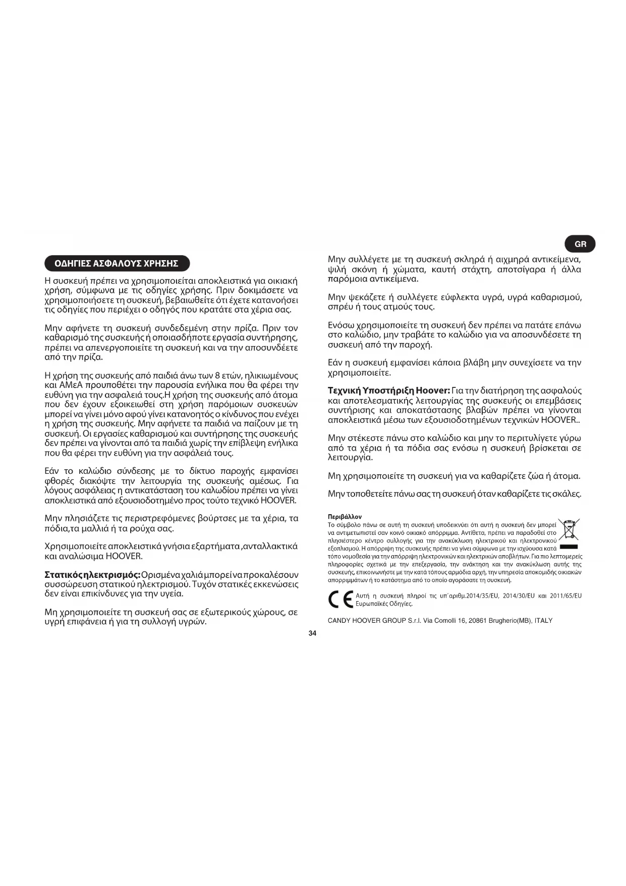 Käytä vain alkuperäisiä Hoover-varaosia. Niitä on saatavana paikalliselta Hoover- jälleenmyyjältä tai valtuutetusta huoltoliikkeestä. Mainitse varaosatilauksen yhteydessä laitteen tyyppinumero. Hoover-huolto Ota huoltoon liittyvissä asioissa yhteyttä paikalliseen Hoover-huoltoon. Laatu BSI ISO 9001 Hooverin tehtaat on arvioitu laadun suhteen ulkopuolisen riippumattoman tahon toimesta. Tuotantoprosessimme täyttävät ISO 9001 -laatujärjestelmän vaatimukset. TAKUU Tämän laitteen takuuehdot määrittelee sen maan Hoover-edustaja, josta laite on ostettu. Yksityiskohtaiset tiedot näistä ehdoista saa laitteen myyneeltä jälleenmyyjältä. Tämän takuun mukaisia vaateita esitettäessä on esitettävä laitteen myyntitodistus tai ostokuitti. Oikeus muutoksiin pidätetään.34 ΟΔΗΓΙΕΣ ΑΣΦΑΛΟΥΣ ΧΡΗΣΗΣ H συσκευή πρέπει να χρησιμοποιείται αποκλειστικά για οικιακή χρήση, σύμφωνα με τις οδηγίες χρήσης. Πριν δοκιμάσετε να χρησιμοποιήσετε τη συσκευή, βεβαιωθείτε ότι έχετε κατανοήσει τις οδηγίες που περιέχει ο οδηγός που κρατάτε στα χέρια σας. Μην αφήνετε τη συσκευή συνδεδεμένη στην πρίζα. Πριν τον καθαρισμό της συσκευής ή οποιασδήποτε εργασία συντήρησης, πρέπει να απενεργοποιείτε τη συσκευή και να την αποσυνδέετε από την πρίζα. Η χρήση της συσκευής από παιδιά άνω των 8 ετών, ηλικιωμένους και ΑΜεΑ προυποθέτει την παρουσία ενήλικα που θα φέρει την ευθύνη για την ασφαλειά τους.Η χρήση της συσκευής από άτομα που δεν έχουν εξοικειωθεί στη χρήση παρόμοιων συσκευών μπορεί να γίνει μόνο αφού γίνει κατανοητός ο κίνδυνος που ενέχει η χρήση της συσκευής. Μην αφήνετε τα παιδιά να παίζουν με τη συσκευή. Οι εργασίες καθαρισμού και συντήρησης της συσκευής δεν πρέπει να γίνονται από τα παιδιά χωρίς την επίβλεψη ενήλικα που θα φέρει την ευθύνη για την ασφάλειά τους. Εάν το καλώδιο σύνδεσης με το δίκτυο παροχής εμφανίσει φθορές διακόψτε την λειτουργία της συσκευής αμέσως. Για λόγους ασφάλειας η αντικατάσταση του καλωδίου πρέπει να γίνει αποκλειστικά από εξουσιοδοτημένο προς τούτο τεχνικό HOOVER. Μην πλησιάζετε τις περιστρεφόμενες βούρτσες με τα χέρια, τα πόδια,τα μαλλιά ή τα ρούχα σας. Χρησιμοποιείτε αποκλειστικά γνήσια εξαρτήματα ,ανταλλακτικά και αναλώσιμα HOOVER. Στατικός ηλεκτρισμός: Ορισμένα χαλιά μπορεί να προκαλέσουν συσσώρευση στατικού ηλεκτρισμού. Τυχόν στατικές εκκενώσεις δεν είναι επικίνδυνες για την υγεία. Μη χρησιμοποιείτε τη συσκευή σας σε εξωτερικούς χώρους, σε υγρή επιφάνεια ή για τη συλλογή υγρών. Μην συλλέγετε με τη συσκευή σκληρά ή αιχμηρά αντικείμενα, ψιλή σκόνη ή χώματα, καυτή στάχτη, αποτσίγαρα ή άλλα παρόμοια αντικείμενα. Μην ψεκάζετε ή συλλέγετε εύφλεκτα υγρά, υγρά καθαρισμού, σπρέυ ή τους ατμούς τους. Ενόσω χρησιμοποιείτε τη συσκευή δεν πρέπει να πατάτε επάνω στο καλώδιο, μην τραβάτε το καλώδιο για να αποσυνδέσετε τη συσκευή από την παροχή. Εάν η συσκευή εμφανίσει κάποια βλάβη μην συνεχίσετε να την χρησιμοποιείτε. Τεχνική Υποστήριξη Hoover: Για την διατήρηση της ασφαλούς και αποτελεσματικής λειτουργίας της συσκευής οι επεμβάσεις συντήρισης και αποκατάστασης βλαβών πρέπει να γίνονται αποκλειστικά μέσω των εξουσιοδοτημένων τεχνικών HOOVER.. Μην στέκεστε πάνω στο καλώδιο και μην το περιτυλίγετε γύρω από τα χέρια ή τα πόδια σας ενόσω η συσκευή βρίσκεται σε λειτουργία. Μη χρησιμοποιείτε τη συσκευή για να καθαρίζετε ζώα ή άτομα. Μην τοποθετείτε πάνω σας τη συσκευή όταν καθαρίζετε τις σκάλες.
