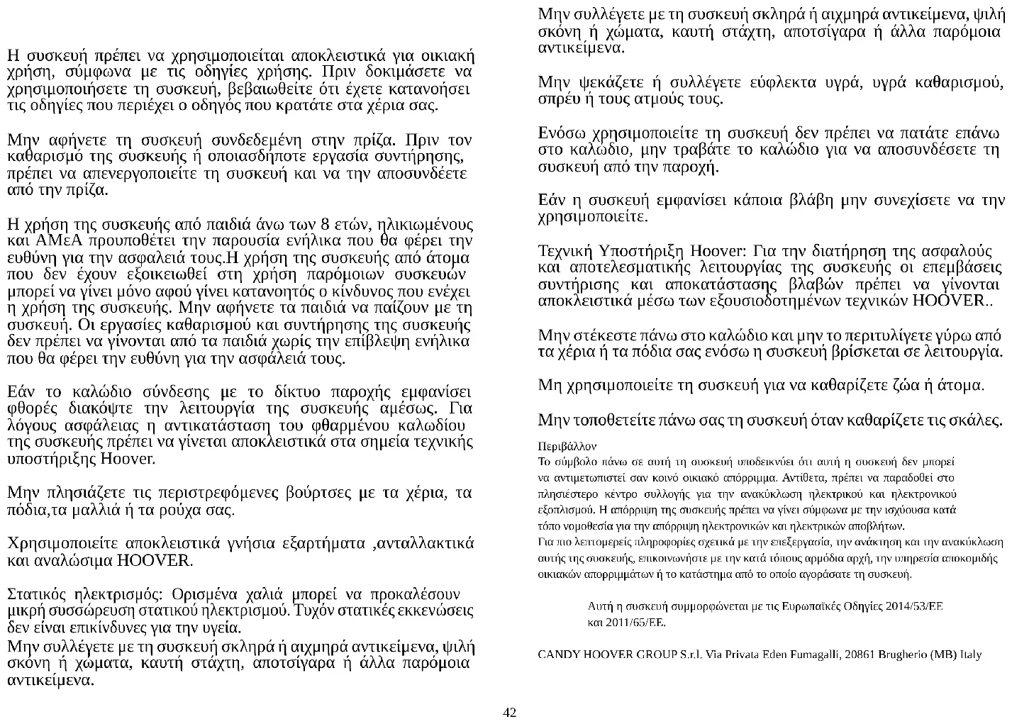 FI42 ΟΔΗΓΙΕΣ ΑΣΦΑΛΟΥΣ ΧΡΗΣΗΣ H συσκευή πρέπει να χρησιμοποιείται αποκλειστικά για οικιακή χρήση, σύμφωνα με τις οδηγίες χρήσης. Πριν δοκιμάσετε να χρησιμοποιήσετε τη συσκευή, βεβαιωθείτε ότι έχετε κατανοήσει τις οδηγίες που περιέχει ο οδηγός που κρατάτε στα χέρια σας. Μην αφήνετε τη συσκευή συνδεδεμένη στην πρίζα. Πριν τον καθαρισμό της συσκευής ή οποιασδήποτε εργασία συντήρησης, πρέπει να απενεργοποιείτε τη συσκευή και να την αποσυνδέετε από την πρίζα. Η χρήση της συσκευής από παιδιά άνω των 8 ετών, ηλικιωμένους και ΑΜεΑ προυποθέτει την παρουσία ενήλικα που θα φέρει την ευθύνη για την ασφαλειά τους.Η χρήση της συσκευής από άτομα που δεν έχουν εξοικειωθεί στη χρήση παρόμοιων συσκευών μπορεί να γίνει μόνο αφού γίνει κατανοητός ο κίνδυνος που ενέχει η χρήση της συσκευής. Μην αφήνετε τα παιδιά να παίζουν με τη συσκευή. Οι εργασίες καθαρισμού και συντήρησης της συσκευής δεν πρέπει να γίνονται από τα παιδιά χωρίς την επίβλεψη ενήλικα που θα φέρει την ευθύνη για την ασφάλειά τους. Εάν το καλώδιο σύνδεσης με το δίκτυο παροχής εμφανίσει φθορές διακόψτε την λειτουργία της συσκευής αμέσως. Για λόγους ασφάλειας η αντικατάσταση του φθαρμένου καλωδίου της συσκευής πρέπει να γίνεται αποκλειστικά στα σημεία τεχνικής υποστήριξης Hoover. Μην πλησιάζετε τις περιστρεφόμενες βούρτσες με τα χέρια, τα πόδια,τα μαλλιά ή τα ρούχα σας. Χρησιμοποιείτε αποκλειστικά γνήσια εξαρτήματα ,ανταλλακτικά και αναλώσιμα HOOVER. Στατικός ηλεκτρισμός: Ορισμένα χαλιά μπορεί να προκαλέσουν μικρή συσσώρευση στατικού ηλεκτρισμού. Τυχόν στατικές εκκενώσεις δεν είναι επικίνδυνες για την υγεία. Μην συλλέγετε με τη συσκευή σκληρά ή αιχμηρά αντικείμενα, ψιλή σκόνη ή χώματα, καυτή στάχτη, αποτσίγαρα ή άλλα παρόμοια αντικείμενα. Μην συλλέγετε με τη συσκευή σκληρά ή αιχμηρά αντικείμενα, ψιλή σκόνη ή χώματα, καυτή στάχτη, αποτσίγαρα ή άλλα παρόμοια αντικείμενα. Μην ψεκάζετε ή συλλέγετε εύφλεκτα υγρά, υγρά καθαρισμού, σπρέυ ή τους ατμούς τους. Ενόσω χρησιμοποιείτε τη συσκευή δεν πρέπει να πατάτε επάνω στο καλώδιο, μην τραβάτε το καλώδιο για να αποσυνδέσετε τη συσκευή από την παροχή. Εάν η συσκευή εμφανίσει κάποια βλάβη μην συνεχίσετε να την χρησιμοποιείτε. Τεχνική Υποστήριξη Hoover: Για την διατήρηση της ασφαλούς και αποτελεσματικής λειτουργίας της συσκευής οι επεμβάσεις συντήρισης και αποκατάστασης βλαβών πρέπει να γίνονται αποκλειστικά μέσω των εξουσιοδοτημένων τεχνικών HOOVER.. Μην στέκεστε πάνω στο καλώδιο και μην το περιτυλίγετε γύρω από τα χέρια ή τα πόδια σας ενόσω η συσκευή βρίσκεται σε λειτουργία. Μη χρησιμοποιείτε τη συσκευή για να καθαρίζετε ζώα ή άτομα. Μην τοποθετείτε πάνω σας τη συσκευή όταν καθαρίζετε τις σκάλες.