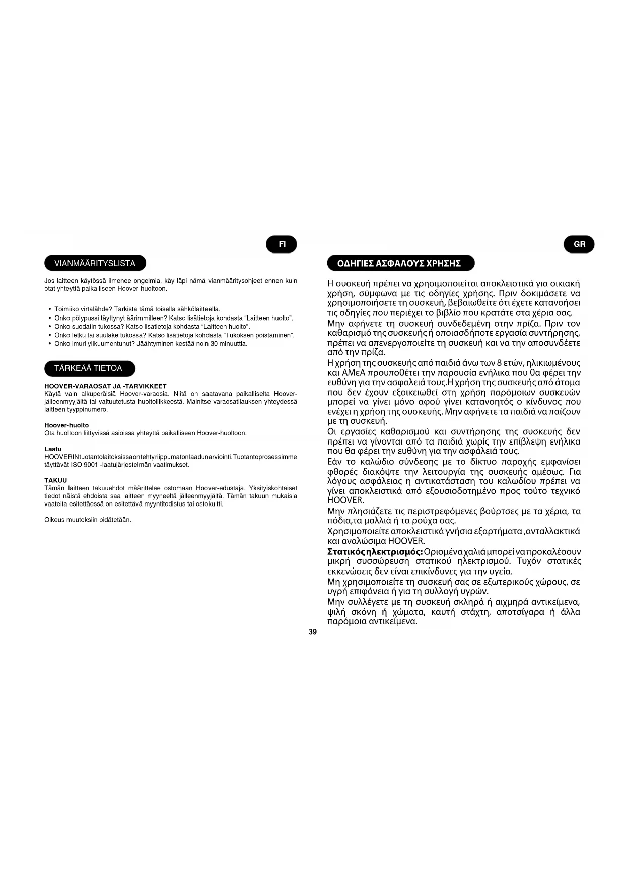 Käytä vain alkuperäisiä Hoover-varaosia. Niitä on saatavana paikalliselta Hoover- jälleenmyyjältä tai valtuutetusta huoltoliikkeestä. Mainitse varaosatilauksen yhteydessä laitteen tyyppinumero. Hoover-huolto Ota huoltoon liittyvissä asioissa yhteyttä paikalliseen Hoover-huoltoon. Laatu HOOVERIN tuotantolaitoksissa on tehty riippumaton laadunarviointi. Tuotantoprosessimme täyttävät ISO 9001 -laatujärjestelmän vaatimukset. TAKUU Tämän laitteen takuuehdot määrittelee ostomaan Hoover-edustaja. Yksityiskohtaiset tiedot näistä ehdoista saa laitteen myyneeltä jälleenmyyjältä. Tämän takuun mukaisia vaateita esitettäessä on esitettävä myyntitodistus tai ostokuitti. Oikeus muutoksiin pidätetään. ΟΔΗΓΙΕΣ ΑΣΦΑΛΟΥΣ ΧΡΗΣΗΣ H συσκευή πρέπει να χρησιμοποιείται αποκλειστικά για οικιακή χρήση, σύμφωνα με τις οδηγίες χρήσης. Πριν δοκιμάσετε να χρησιμοποιήσετε τη συσκευή, βεβαιωθείτε ότι έχετε κατανοήσει τις οδηγίες που περιέχει το βιβλίο που κρατάτε στα χέρια σας. Μην αφήνετε τη συσκευή συνδεδεμένη στην πρίζα. Πριν τον καθαρισμό της συσκευής ή οποιασδήποτε εργασία συντήρησης, πρέπει να απενεργοποιείτε τη συσκευή και να την αποσυνδέετε από την πρίζα. Η χρήση της συσκευής από παιδιά άνω των 8 ετών, ηλικιωμένους και ΑΜεΑ προυποθέτει την παρουσία ενήλικα που θα φέρει την ευθύνη για την ασφαλειά τους.Η χρήση της συσκευής από άτομα που δεν έχουν εξοικειωθεί στη χρήση παρόμοιων συσκευών μπορεί να γίνει μόνο αφού γίνει κατανοητός ο κίνδυνος που ενέχει η χρήση της συσκευής. Μην αφήνετε τα παιδιά να παίζουν με τη συσκευή. Οι εργασίες καθαρισμού και συντήρησης της συσκευής δεν πρέπει να γίνονται από τα παιδιά χωρίς την επίβλεψη ενήλικα που θα φέρει την ευθύνη για την ασφάλειά τους. Εάν το καλώδιο σύνδεσης με το δίκτυο παροχής εμφανίσει φθορές διακόψτε την λειτουργία της συσκευής αμέσως. Για λόγους ασφάλειας η αντικατάσταση του καλωδίου πρέπει να γίνει αποκλειστικά από εξουσιοδοτημένο προς τούτο τεχνικό HOOVER. Μην πλησιάζετε τις περιστρεφόμενες βούρτσες με τα χέρια, τα πόδια,τα μαλλιά ή τα ρούχα σας. Χρησιμοποιείτε αποκλειστικά γνήσια εξαρτήματα ,ανταλλακτικά και αναλώσιμα HOOVER. Στατικός ηλεκτρισμός: Ορισμένα χαλιά μπορεί να προκαλέσουν μικρή συσσώρευση στατικού ηλεκτρισμού. Τυχόν στατικές εκκενώσεις δεν είναι επικίνδυνες για την υγεία. Μη χρησιμοποιείτε τη συσκευή σας σε εξωτερικούς χώρους, σε υγρή επιφάνεια ή για τη συλλογή υγρών. Μην συλλέγετε με τη συσκευή σκληρά ή αιχμηρά αντικείμενα, ψιλή σκόνη ή χώματα, καυτή στάχτη, αποτσίγαρα ή άλλα παρόμοια αντικείμενα. GR40 Μην ψεκάζετε ή συλλέγετε εύφλεκτα υγρά, υγρά καθαρισμού, σπρέυ ή τους ατμούς τους. Ενόσω χρησιμοποιείτε τη συσκευή δεν πρέπει να πατάτε επάνω στο καλώδιο, μην τραβάτε το καλώδιο για να αποσυνδέσετε τη συσκευή από την παροχή. Εάν η συσκευή εμφανίσει κάποια βλάβη μην συνεχίσετε να την χρησιμοποιείτε. Μην στέκεστε πάνω στο καλώδιο και μην το περιτυλίγετε γύρω από τα χέρια ή τα πόδια σας ενόσω η συσκευή βρίσκεται σε λειτουργία. Μη χρησιμοποιείτε τη συσκευή για να καθαρίζετε ζώα ή άτομα. Μην τοποθετείτε πάνω σας τη συσκευή όταν καθαρίζετε τις