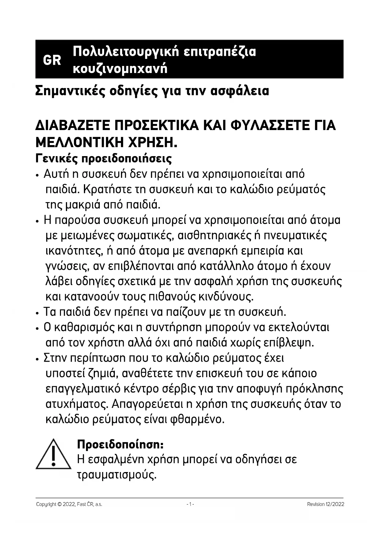 - Στην περίπτωση που το καλώδιο ρεύματος έχει υποστεί ζημιά, αναθέτετε την επισκευή του σε κάποιο επαγγελματικό κέντρο σέρβις για την αποφυγή πρόκλησης ατυχήματος. Απαγορεύεται η χρήση της συσκευής όταν το καλώδιο ρεύματος είναι φθαρμένο. Προειδοποίηση: Ή εσφαλμένη χρήση μπορεί να οδηγήσει σε τραυματισμούς.- 2 - Revision 12/2022 Copyright © 2022, Fast ČR, a.s.