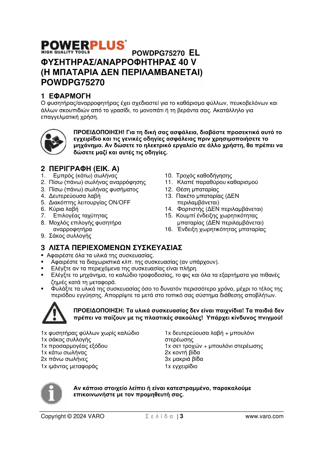 - 16 ΔΗΛΩΣΗ ΣΥΜΜΟΡΦΩΣΗΣ POWDPG75270 EL Copyright © 2024 VARO Σ ε λ ί δ α | 3 www.varo.com ΦΥΣΗΤΗΡΑΣ/ΑΝΑΡΡΟΦΗΤΗΡΑΣ 40 V (H ΜΠΑΤΑΡΙΑ ΔΕΝ ΠΕΡΙΛΑΜΒΑΝΕΤΑΙ) POWDPG75270 1 ΕΦΑΡΜΟΓΗ Ο φυσητήρας/αναρροφητήρας έχει σχεδιαστεί για το καθάρισμα φύλλων, πευκοβελόνων και άλλων σκουπιδιών από το γρασίδι, το μονοπάτι ή τη βεράντα σας. Ακατάλληλο για επαγγελματική χρήση. ΠΡΟΕΙΔΟΠΟΙΗΣΗ! Για τη δική σας ασφάλεια, διαβάστε προσεκτικά αυτό το εγχειρίδιο και τις γενικές οδηγίες ασφάλειας πριν χρησιμοποιήσετε το μηχάνημα. Αν δώσετε το ηλεκτρικό εργαλείο σε άλλο χρήστη, θα πρέπει να δώσετε μαζί και αυτές τις οδηγίες. 2 ΠΕΡΙΓΡΑΦΗ (ΕΙΚ. A) p. 14