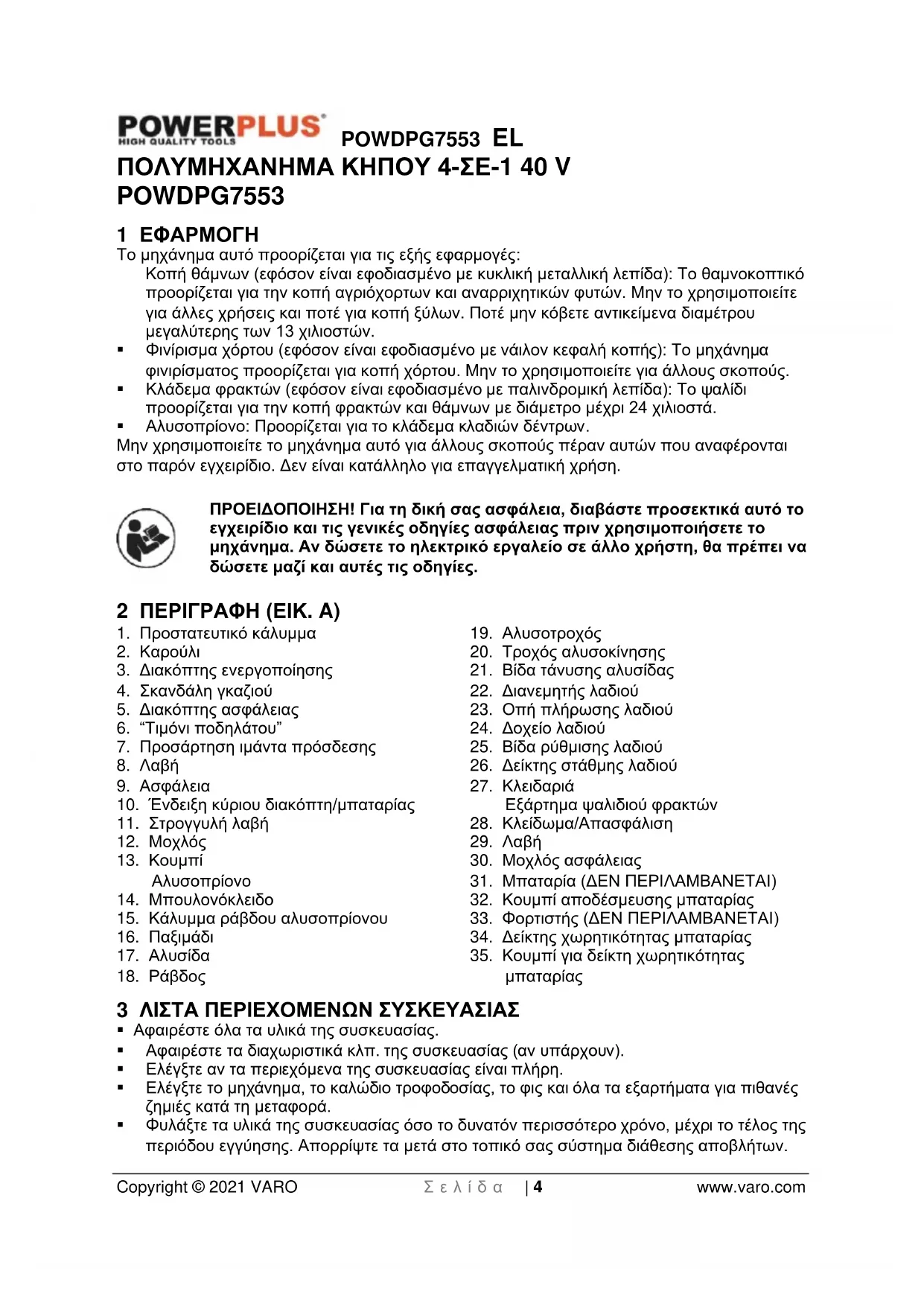 - Ελέγχετε τακτικά τις λεπίδες για ζημιές και αντικαταστήστε όπως απαιτείται.POWDPG7553 EL Copyright © 2021 VARO Σ ε λ ί δ α | 19 www.varo.com