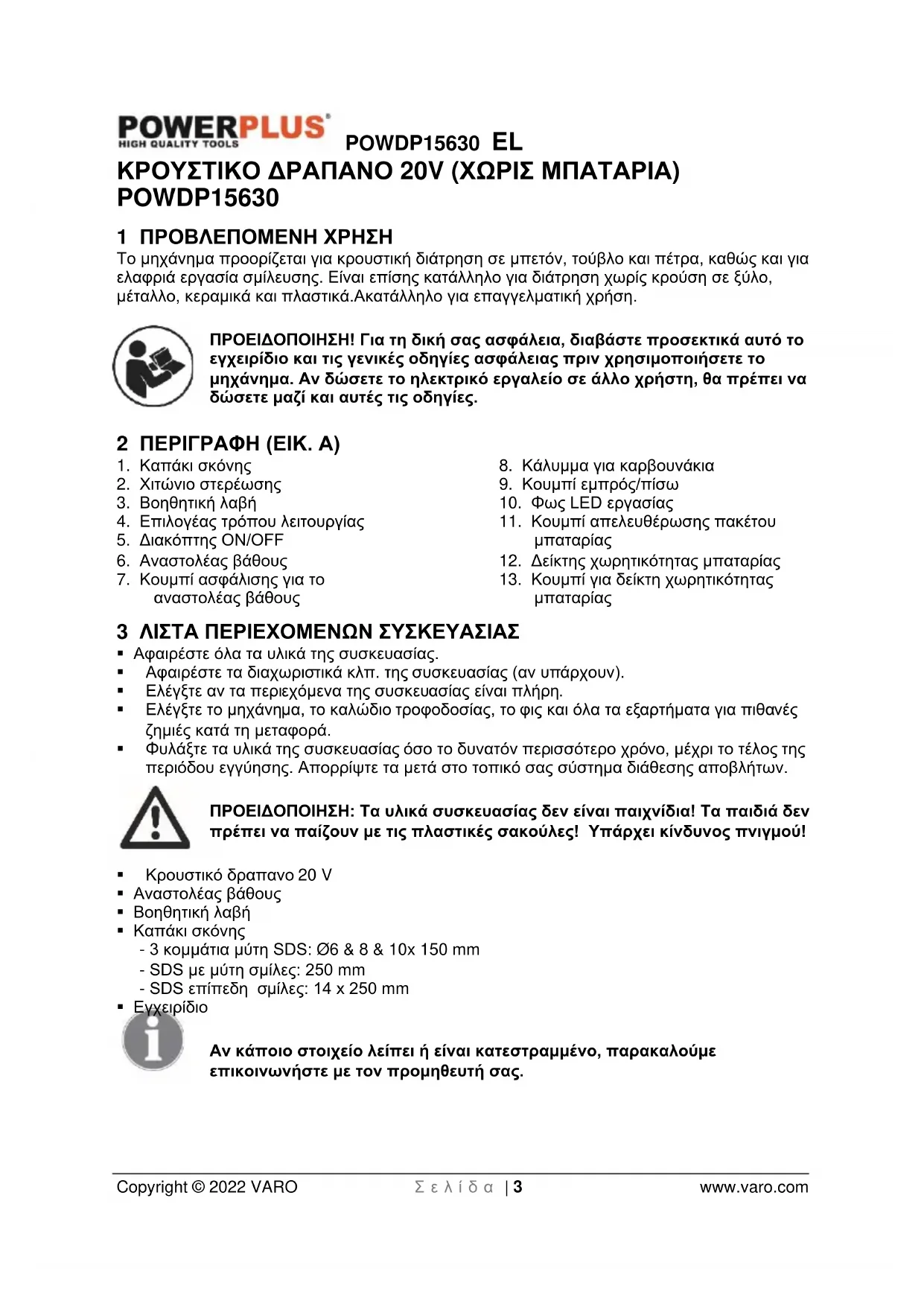 - 15 ΔΗΛΩΣΗ ΣΥΜΜΟΡΦΩΣΗΣ POWDP15630 EL Copyright © 2022 VARO Σ ε λ ί δ α | 3 www.varo.com ΚΡΟΥΣΤΙΚΟ ΔΡΑΠΑΝΟ 20V (ΧΩΡΙΣ ΜΠΑΤΑΡΙΑ) POWDP15630 1 ΠΡΟΒΛΕΠΟΜΕΝΗ ΧΡΗΣΗ Το μηχάνημα προορίζεται για κρουστική διάτρηση σε μπετόν, τούβλο και πέτρα, καθώς και για ελαφριά εργασία σμίλευσης. Είναι επίσης κατάλληλο για διάτρηση χωρίς κρούση σε ξύλο, μέταλλο, κεραμικά και πλαστικά.Ακατάλληλο για επαγγελματική χρήση. ΠΡΟΕΙΔΟΠΟΙΗΣΗ! Για τη δική σας ασφάλεια, διαβάστε προσεκτικά αυτό το εγχειρίδιο και τις γενικές οδηγίες ασφάλειας πριν χρησιμοποιήσετε το μηχάνημα. Αν δώσετε το ηλεκτρικό εργαλείο σε άλλο χρήστη, θα πρέπει να δώσετε μαζί και αυτές τις οδηγίες. 2 ΠΕΡΙΓΡΑΦΗ (ΕΙΚ. A) p. 14