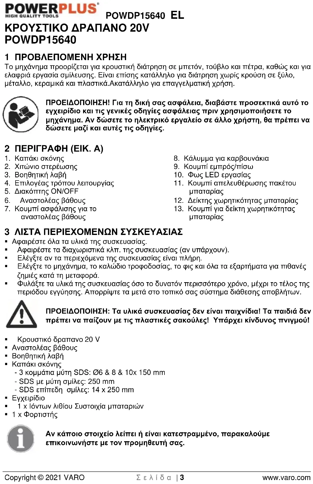 Κατεβάστε τις οδηγίες για το τρυπάνι σε μορφή PDF δωρεάν! Βρείτε το εγχειρίδιό σας POWDP15640 - PowerPlus και πάρτε ξανά την ηλεκτρονική σας συσκευή στα χέρια σας. Σε αυτή τη σελίδα δημοσιεύονται όλα τα έγγραφα που απαιτούνται για τη χρήση της συσκευής σας. POWDP15640 της μάρκας PowerPlus.