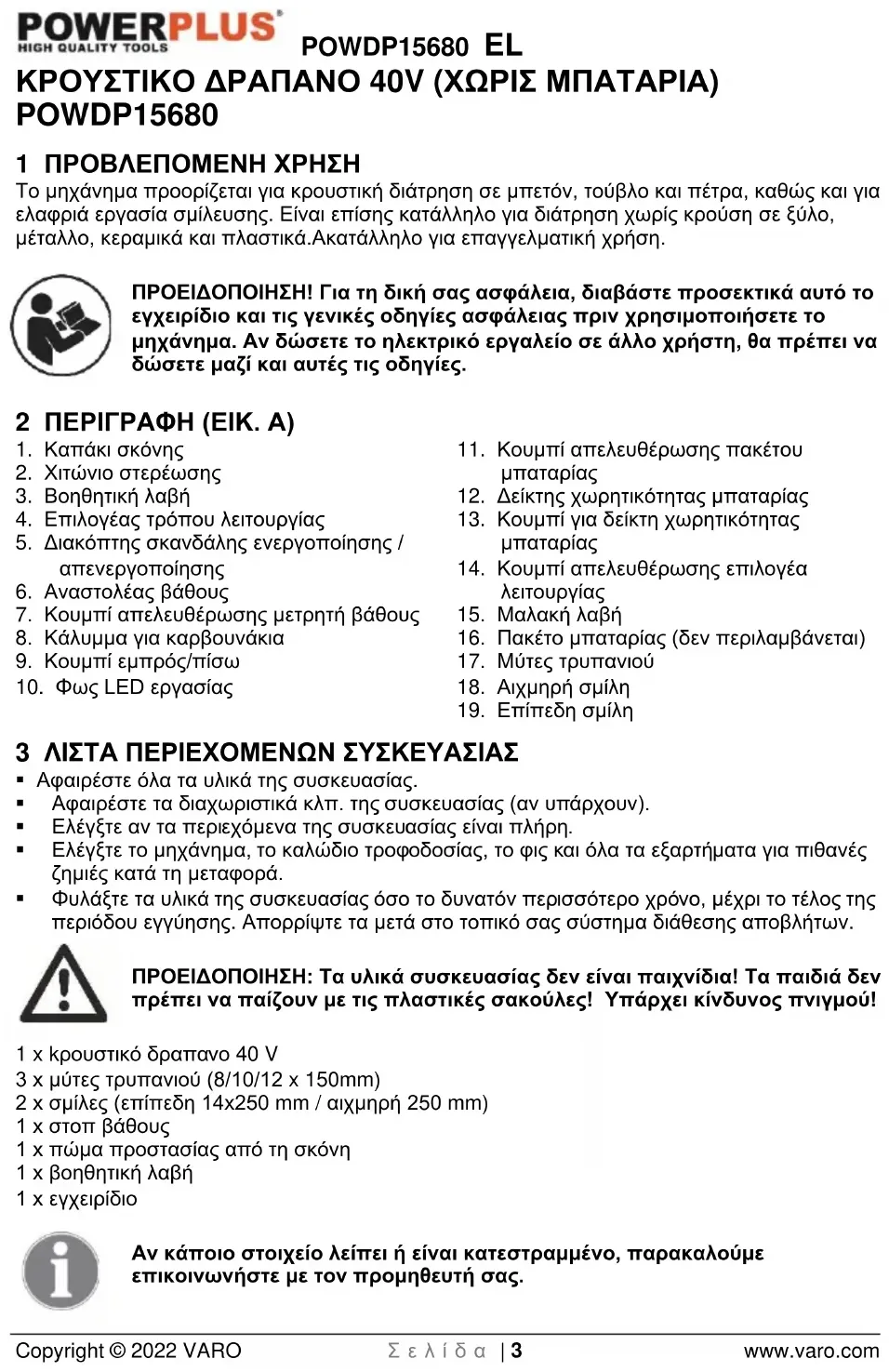 Κατεβάστε τις οδηγίες για το τρυπάνι σε μορφή PDF δωρεάν! Βρείτε το εγχειρίδιό σας POWDP15680 - PowerPlus και πάρτε ξανά την ηλεκτρονική σας συσκευή στα χέρια σας. Σε αυτή τη σελίδα δημοσιεύονται όλα τα έγγραφα που απαιτούνται για τη χρήση της συσκευής σας. POWDP15680 της μάρκας PowerPlus.
