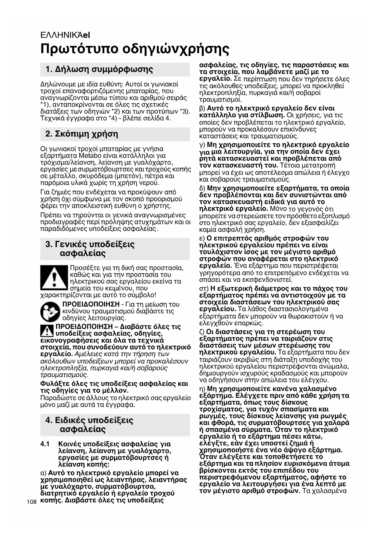 Πρωτότυπο οδηγιώνχρήσης Δηλώνουμε με ιδία ευθύνη: Αυτοί οι γωνιακοί τροχοί επαναφορτιζόμενης μπαταρίας, που αναγνωρίζονται μέσω τύπου και αριθμού σειράς *1), ανταποκρίνονται σε όλες τις σχετικές διατάξεις των οδηγιών *2) και των προτύπων *3). Τεχνικά έγγραφα στο *4) - βλέπε σελίδα 4. Οι γωνιακοί τροχοί μπαταρίας με γνήσια εξαρτήματα Metabo είναι κατάλληλοι για τρόχισμα/λείανση, λείανση με γυαλόχαρτο, εργασίες με συρματόβουρτσες και τροχούς κοπής σε μέταλλο, σκυρόδεμα (μπετόν), πέτρα και παρόμοια υλικά χωρίς τη χρήση νερού. Για ζημιές που ενδέχεται να προκύψουν από χρήση όχι σύμφωνα με τον σκοπό προορισμού φέρει την αποκλειστική ευθύνη ο χρήστης. Πρέπει να τηρούνται οι γενικά αναγνωρισμένες προδιαγραφές περί πρόληψης ατυχημάτων και οι παραδιδόμενες υποδείξεις ασφαλείας