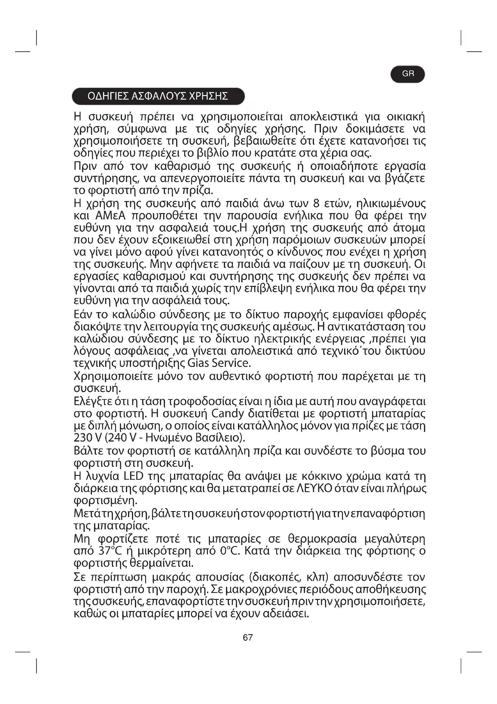 Ελέγξτε ότι η τάση τροφοδοσίας είναι η ίδια με αυτή που αναγράφεται στο φορτιστή. Η συσκευή Candy διατίθεται με φορτιστή μπαταρίας με διπλή μόνωση, ο οποίος είναι κατάλληλος μόνον για πρίζες με τάση 230 V (240 V - Ηνωμένο Βασίλειο). Βάλτε τον φορτιστή σε κατάλληλη πρίζα και συνδέστε το βύσμα του φορτιστή στη συσκευή. Η λυχνία LED της μπαταρίας θα ανάψει με κόκκινο χρώμα κατά τη διάρκεια της φόρτισης και θα μετατραπεί σε ΛΕΥΚΟ όταν είναι πλήρως φορτισμένη. Μετά τη χρήση, βάλτε τη συσκευή στον φορτιστή για την επαναφόρτιση της μπαταρίας. Μη φορτίζετε ποτέ τις μπαταρίες σε θερμοκρασία μεγαλύτερη από 37°C ή μικρότερη από 0°C. Κατά την διάρκεια της φόρτισης ο φορτιστής θερμαίνεται. Σε περίπτωση μακράς απουσίας (διακοπές, κλπ) αποσυνδέστε τον φορτιστή από την παροχή. Σε μακροχρόνιες περιόδους αποθήκευσης της συσκευής, επαναφορτίστε την συσκευή πριν την χρησιμοποιήσετε, καθώς οι μπαταρίες μπορεί να έχουν αδειάσει. GR68 Χρησιμοποιείτε αποκλειστικά τα εξαρτήματα, αναλώσιμα ή ανταλλακτικά που συνιστώνται ή διατίθενται από τη Hoover. Στατικός ηλεκτρισμός: ορισμένα χαλιά μπορεί να προκαλέσουν συσσώρευση στατικού ηλεκτρισμού. Τυχόν στατικές εκκενώσεις δεν είναι επικίνδυνες για την υγεία. Μην πλησιάζετε τις περιστρεφόμενες βούρτσες με τα χέρια, τα πόδια,τα μαλλιά ή τα ρούχα σας. Μην αποσυνδέετε το φορτιστή τραβώντας το καλώδιο. Μη χρησιμοποιείτε τη συσκευή σας σε εξωτερικούς χώρους, σε υγρή επιφάνεια ή για τη συλλογή υγρών. Μην συλλέγετε με τη συσκευή σκληρά ή αιχμηρά αντικείμενα, ψιλή σκόνη ή χώματα, καυτή στάχτη, αποτσίγαρα ή άλλα παρόμοια αντικείμενα. Μην ψεκάζετε ή συλλέγετε εύφλεκτα υγρά, υγρά καθαρισμού, σπρέυ ή τους ατμούς τους. Ενόσω χρησιμοποιείτε τη συσκευή δεν πρέπει να πατάτε επάνω στο καλώδιο, μην τραβάτε το καλώδιο για να αποσυνδέσετε τη συσκευή από την παροχή. Μη συνεχίσετε να χρησιμοποιείτε τη συσκευή ή το φορτιστή αν παρουσιάζουν βλάβη. Μη χρησιμοποιείτε τη συσκευή για να καθαρίζετε ζώα ή άτομα. Μην αντικαθιστάτε τις μπαταρίες με μη επαναφορτιζόμενες μπαταρίες. Τεχνική Υποστήριξη Hoover: Για τις εργασίες συντήρησης ή αποκατάστασης κακής λειτουργίας ή βλάβης πρέπει να απευθύνεστε αποκλειστικά στα κέντρα τεχνικής υποστήριξης Hoover, έτσι εξασφαλίζετε την ασφαλή και αποτελεσματική λειτουργία της
