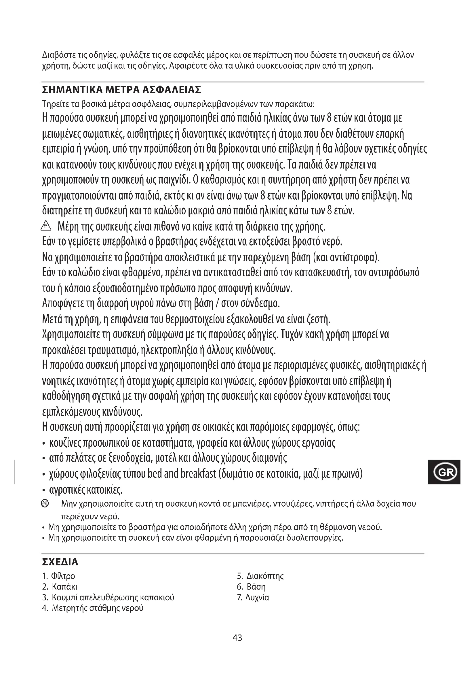 Τηρείτε τα βασικά μέτρα ασφάλειας, συμπεριλαμβανομένων των παρακάτω: Η παρούσα συσκευή μπορεί να χρησιμοποιηθεί από παιδιά ηλικίας άνω των 8 ετών και άτομα με μειωμένες σωματικές, αισθητήριες ή διανοητικές ικανότητες ή άτομα που δεν διαθέτουν επαρκή εμπειρία ή γνώση, υπό την προϋπόθεση ότι θα βρίσκονται υπό επίβλεψη ή θα λάβουν σχετικές οδηγίες και κατανοούν τους κινδύνους που ενέχει η χρήση της συσκευής. Τα παιδιά δεν πρέπει να χρησιμοποιούν τη συσκευή ως παιχνίδι. Ο καθαρισμός και η συντήρηση από χρήστη δεν πρέπει να πραγματοποιούνται από παιδιά, εκτός κι αν είναι άνω των 8 ετών και βρίσκονται υπό επίβλεψη. Να διατηρείτε τη συσκευή και το καλώδιο μακριά από παιδιά ηλικίας κάτω των 8 ετών. h Μέρη της συσκευής είναι πιθανό να καίνε κατά τη διάρκεια της χρήσης. Εάν το γεμίσετε υπερβολικά ο βραστήρας ενδέχεται να εκτοξεύσει βραστό νερό. Να χρησιμοποιείτε το βραστήρα αποκλειστικά με την παρεχόμενη βάση (και αντίστροφα). Εάν το καλώδιο είναι φθαρμένο, πρέπει να αντικατασταθεί από τον κατασκευαστή, τον αντιπρόσωπό του ή κάποιο εξουσιοδοτημένο πρόσωπο προς αποφυγή κινδύνων. Αποφύγετε τη διαρροή υγρού πάνω στη βάση / στον σύνδεσμο. Μετά τη χρήση, η επιφάνεια του θερμοστοιχείου εξακολουθεί να είναι ζεστή. Χρησιμοποιείτε τη συσκευή σύμφωνα με τις παρούσες οδηγίες. Τυχόν κακή χρήση μπορεί να προκαλέσει τραυματισμό, ηλεκτροπληξία ή άλλους κινδύνους. Η παρούσα συσκευή μπορεί να χρησιμοποιηθεί από άτομα με περιορισμένες φυσικές, αισθητηριακές ή νοητικές ικανότητες ή άτομα χωρίς εμπειρία και γνώσεις, εφόσον βρίσκονται υπό επίβλεψη ή καθοδήγηση σχετικά με την ασφαλή χρήση της συσκευής και εφόσον έχουν κατανοήσει τους εμπλεκόμενους κινδύνους. Η συσκευή αυτή προορίζεται για χρήση σε οικιακές και παρόμοιες εφαρμογές, όπως:
