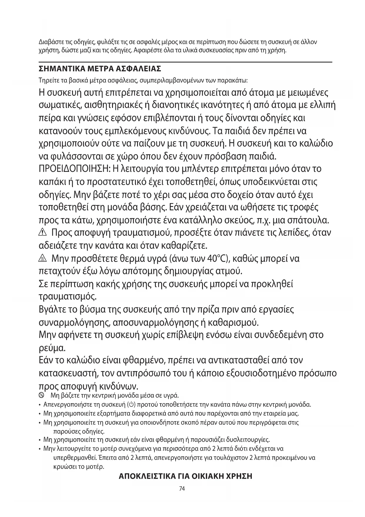 AE74 Διαβάστε τις οδηγίες, φυλάξτε τις σε ασφαλές μέρος και σε περίπτωση που δώσετε τη συσκευή σε άλλον χρήστη, δώστε μαζί και τις οδηγίες. Αφαιρέστε όλα τα υλικά συσκευασίας πριν από τη χρήση. ΣΗΜΑΝΤΙΚΑ ΜΕΤΡΑ ΑΣΦΑΛΕΙΑΣ Τηρείτε τα βασικά μέτρα ασφάλειας, συμπεριλαμβανομένων των παρακάτω: Η συσκευή αυτή επιτρέπεται να χρησιμοποιείται από άτομα με μειωμένες σωματικές, αισθητηριακές ή διανοητικές ικανότητες ή από άτομα με ελλιπή πείρα και γνώσεις εφόσον επιβλέπονται ή τους δίνονται οδηγίες και κατανοούν τους εμπλεκόμενους κινδύνους. Τα παιδιά δεν πρέπει να χρησιμοποιούν ούτε να παίζουν με τη συσκευή. Η συσκευή και το καλώδιο να φυλάσσονται σε χώρο όπου δεν έχουν πρόσβαση παιδιά. ΠΡΟΕΙΔΟΠΟΙΗΣΗ: Η λειτουργία του μπλέντερ επιτρέπεται μόνο όταν το καπάκι ή το προστατευτικό έχει τοποθετηθεί, όπως υποδεικνύεται στις οδηγίες. Μην βάζετε ποτέ το χέρι σας μέσα στο δοχείο όταν αυτό έχει τοποθετηθεί στη μονάδα βάσης. Εάν χρειάζεται να ωθήσετε τις τροφές προς τα κάτω, χρησιμοποιήστε ένα κατάλληλο σκεύος, π.χ. μια σπάτουλα. c Προς αποφυγή τραυματισμού, προσέξτε όταν πιάνετε τις λεπίδες, όταν αδειάζετε την κανάτα και όταν καθαρίζετε. h Μην προσθέτετε θερμά υγρά (άνω των 40°C), καθώς μπορεί να πεταχτούν έξω λόγω απότομης δημιουργίας ατμού. Σε περίπτωση κακής χρήσης της συσκευής μπορεί να προκληθεί τραυματισμός. Βγάλτε το βύσμα της συσκευής από την πρίζα πριν από εργασίες συναρμολόγησης, αποσυναρμολόγησης ή καθαρισμού. Μην αφήνετε τη συσκευή χωρίς επίβλεψη ενόσω είναι συνδεδεμένη στο