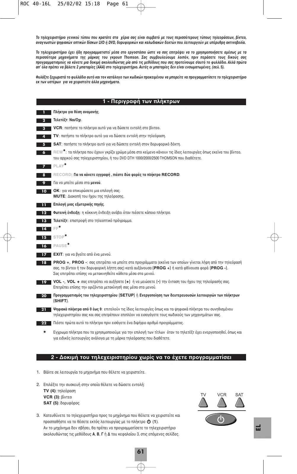 25/02/02 15:18 Page 61 Το τηλεχειριστήριο γενικού τύπου που κρατάτε στα χέρια σασ είναι συµβατÞ µε τουσ περισσÞτερουσ τύπουσ τηλεοράσεων, βίντεο, αναγνωστών ψηφιακών οπτικών δίσκων LVD ή DVD, δορυφορικών και καλωδιακών δεκτών που λειτουργούν µε υπέρυθρη ακτινοβολία. Το τηλειχειριστήριο έχει ήδη προγραµµατιστεί µέσα στο εργοστάσιο ώστε να σασ επιτρέψει να το χρησιµοποιήσετε αµέσωσ µε τα περισσÞτερα µηχανήµατα τησ µάρκασ του γκρουπ Thomson. Σασ συµβουλεύουµε λοιπÞν, πριν περάσετε τουσ δικούσ σασ προγραµµατισµούσ να κάνετε µια δοκιµή ακολουθώντασ µία απÞ τισ µεθÞδουσ που σασ προτείνουµε σ΄αυτÞ το φυλλάδιο. Αλλά πρώτα απ’ Þλα πρέπει να βάλετε 2 µπαταρίεσ (ΑΑΑ) στο τηλεχειριστήριο. Αυτέσ οι µπαταρίεσ δεν είναι ενσωµατωµένεσ. (σελ. 5). Φυλάξτε ξεχωριστά το φυλλάδιο αυτÞ και τον κατάλογο των κωδικών προκειµένου να µπορείτε να προγραµµατίσετε το τηλεχειριστήριο εκ των υστέρων για να χειριστείτε άλλα µηχανήµατα.