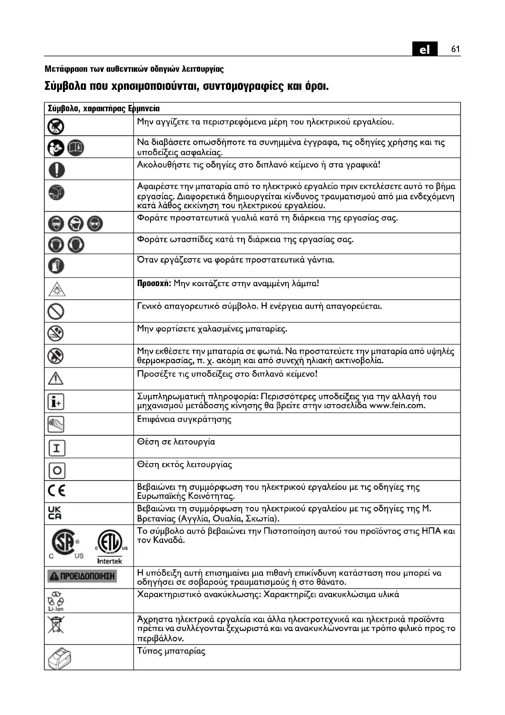 Μετάφραση των αυθεντικών οδηγιών λειτουργίας Σύμβολα που χρησιμοποιούνται, συντομογραφίες και όροι. Σύμβολο, χαρακτήρας Ερμηνεία Μην αγγίζετε τα περιστρεφόμενα μέρη του ηλεκτρικού εργαλείου. Να διαβάσετε οπωσδήποτε τα συνημμένα έγγραφα, τις οδηγίες χρήσης και τις υποδείξεις ασφαλείας. Ακολουθήστε τις οδηγίες στο διπλανό κείμενο ή στα γραφικά! Αφαιρέστε την μπαταρία από το ηλεκτρικό εργαλείο πριν εκτελέσετε αυτό το βήμα εργασίας. Διαφορετικά δημιουργείται κίνδυνος τραυματισμού από μια ενδεχόμενη κατά λάθος εκκίνηση του ηλεκτρικού εργαλείου. Φοράτε προστατευτικά γυαλιά κατά τη διάρκεια της εργασίας σας. Φοράτε ωτασπίδες κατά τη διάρκεια της εργασίας σας. Όταν εργάζεστε να φοράτε προστατευτικά γάντια. Προσοχή: Μην κοιτάζετε στην αναμμένη λάμπα! Γενικό απαγορευτικό σύμβολο. Η ενέργεια αυτή απαγορεύεται. Μην φορτίσετε χαλασμένες μπαταρίες. Μην εκθέσετε την μπαταρία σε φωτιά. Να προστατεύετε την μπαταρία από υψηλές θερμοκρασίας, π. χ. ακόμη και από συνεχή ηλιακή ακτινοβολία. Προσέξτε τις υποδείξεις στο διπλανό κείμενο! Συμπληρωματική πληροφορία: Περισσότερες υποδείξεις για την αλλαγή του μηχανισμού μετάδοσης κίνησης θα βρείτε στην ιστοσελίδα www.fein.com. Επιφάνεια συγκράτησης Θέση σε λειτουργία Θέση εκτός λειτουργίας Βεβαιώνει τη συμμόρφωση του ηλεκτρικού εργαλείου με τις οδηγίες της Ευρωπαϊκής Κοινότητας. Βεβαιώνει τη συμμόρφωση του ηλεκτρικού εργαλείου με τις οδηγίες της Μ. Βρετανίας (Αγγλία, Ουαλία, Σκωτία). Το σύμβολο αυτό βεβαιώνει την Πιστοποίηση αυτού του προϊόντος στις ΗΠΑ και τον Καναδά. Η υπόδειξη αυτή επισημαίνει μια πιθανή επικίνδυνη κατάσταση που μπορεί να οδηγήσει σε σοβαρούς τραυματισμούς ή στο θάνατο. Χαρακτηριστικό ανακύκλωσης: Χαρακτηρίζει ανακυκλώσιμα υλικά Άχρηστα ηλεκτρικά εργαλεία και άλλα ηλεκτροτεχνικά και ηλεκτρικά προϊόντα πρέπει να συλλέγονται ξεχωριστά και να ανακυκλώνονται με τρόπο φιλικό προς το περιβάλλον. Τύπος μπαταρίας62