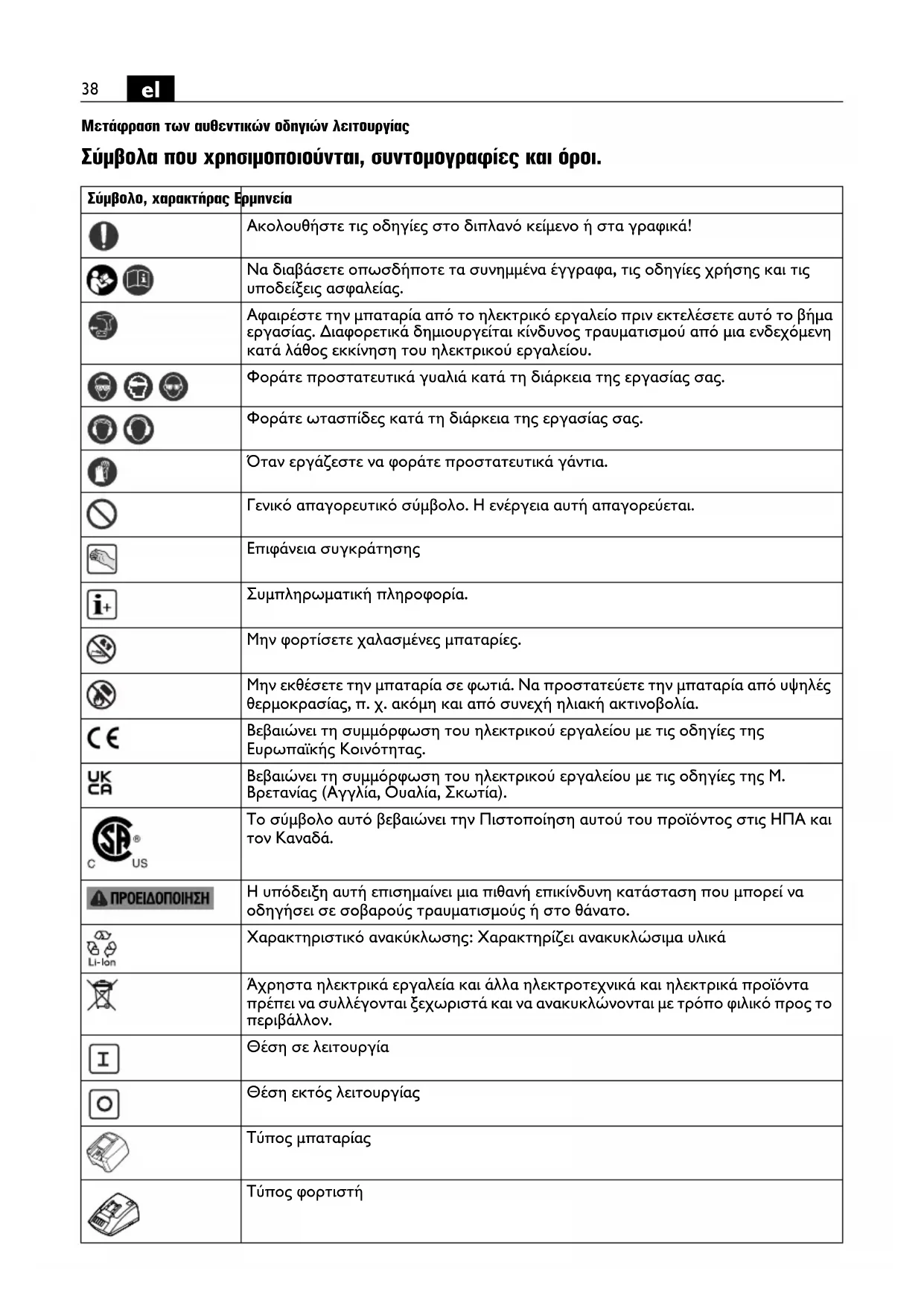 Μετάφραση των αυθεντικών οδηγιών λειτουργίας Σύμβολα που χρησιμοποιούνται, συντομογραφίες και όροι. Σύμβολο, χαρακτήρας Ερμηνεία Ακολουθήστε τις οδηγίες στο διπλανό κείμενο ή στα γραφικά! Να διαβάσετε οπωσδήποτε τα συνημμένα έγγραφα, τις οδηγίες χρήσης και τις υποδείξεις ασφαλείας. Αφαιρέστε την μπαταρία από το ηλεκτρικό εργαλείο πριν εκτελέσετε αυτό το βήμα εργασίας. Διαφορετικά δημιουργείται κίνδυνος τραυματισμού από μια ενδεχόμενη κατά λάθος εκκίνηση του ηλεκτρικού εργαλείου. Φοράτε προστατευτικά γυαλιά κατά τη διάρκεια της εργασίας σας. Φοράτε ωτασπίδες κατά τη διάρκεια της εργασίας σας. Όταν εργάζεστε να φοράτε προστατευτικά γάντια. Γενικό απαγορευτικό σύμβολο. Η ενέργεια αυτή απαγορεύεται. Επιφάνεια συγκράτησης Συμπληρωματική πληροφορία. Μην φορτίσετε χαλασμένες μπαταρίες. Μην εκθέσετε την μπαταρία σε φωτιά. Να προστατεύετε την μπαταρία από υψηλές θερμοκρασίας, π. χ. ακόμη και από συνεχή ηλιακή ακτινοβολία. Βεβαιώνει τη συμμόρφωση του ηλεκτρικού εργαλείου με τις οδηγίες της Ευρωπαϊκής Κοινότητας. Βεβαιώνει τη συμμόρφωση του ηλεκτρικού εργαλείου με τις οδηγίες της Μ. Βρετανίας (Αγγλία, Ουαλία, Σκωτία). Το σύμβολο αυτό βεβαιώνει την Πιστοποίηση αυτού του προϊόντος στις ΗΠΑ και τον Καναδά. Η υπόδειξη αυτή επισημαίνει μια πιθανή επικίνδυνη κατάσταση που μπορεί να οδηγήσει σε σοβαρούς τραυματισμούς ή στο θάνατο. Χαρακτηριστικό ανακύκλωσης: Χαρακτηρίζει ανακυκλώσιμα υλικά Άχρηστα ηλεκτρικά εργαλεία και άλλα ηλεκτροτεχνικά και ηλεκτρικά προϊόντα πρέπει να συλλέγονται ξεχωριστά και να ανακυκλώνονται με τρόπο φιλικό προς το περιβάλλον. Θέση σε λειτουργία Θέση εκτός λειτουργίας Τύπος μπαταρίας Τύπος φορτιστή39