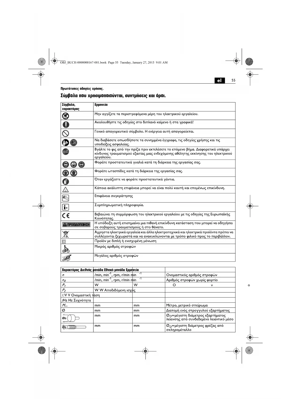 Η εγγύηση για το προϊόν ισχύει σύμφωνα με τις νομικές διατάξεις της χώρας στην οποία κυκλοφορεί. Εκτός αυτού η FEIN σας παρέχει και μια επί πλέον εγγύηση, ανάλογα με την εκάστοτε δήλωση κατασκευαστή της FEIN. Στη συσκευασία του ηλεκτρικού σας εργαλείου μπορεί να περιέχεται μόνο ένα μέρος των εξαρτημάτων που περιγράφονται ή απεικονίζονται σ’ αυτές τις οδηγίες χρήσης. Δήλωση συμμόρφωσης. Η εταιρία FEIN δηλώνει με αποκλειστική ευθύνη της ότι αυτό το προϊόν ανταποκρίνεται πλήρως στους σχετικούς κανονισμούς που αναφέρονται στην τελευταία σελίδα αυτών των οδηγιών χρήσης. Τεχνικά έγγραφα από: C. & E. Fein GmbH, C-DB_IA, D-73529 Schwäbisch Gmünd Προστασία του περιβάλλοντος, απόσυρση. Οι συσκευασίες, τα άχρηστα ηλεκτρικά εργαλεία και τα εξαρτήματα πρέπει να ανακυκλώνονται με τρόπο φιλικό προς το περιβάλλον. Επιλογή εξαρτημάτων (βλέπε σελίδα 13). Χρησιμοποιείτε μόνο γνήσια εξαρτήματα από τη FEIN. Το κάθε εξάρτημα πρέπει να προορίζεται για τον αντίστοιχο τύπο ηλεκτρικού εργαλείου. A Τσοκ OBJ_BUCH-0000000167-001.book Page 60 Tuesday, January 27, 2015 9:01 AM61