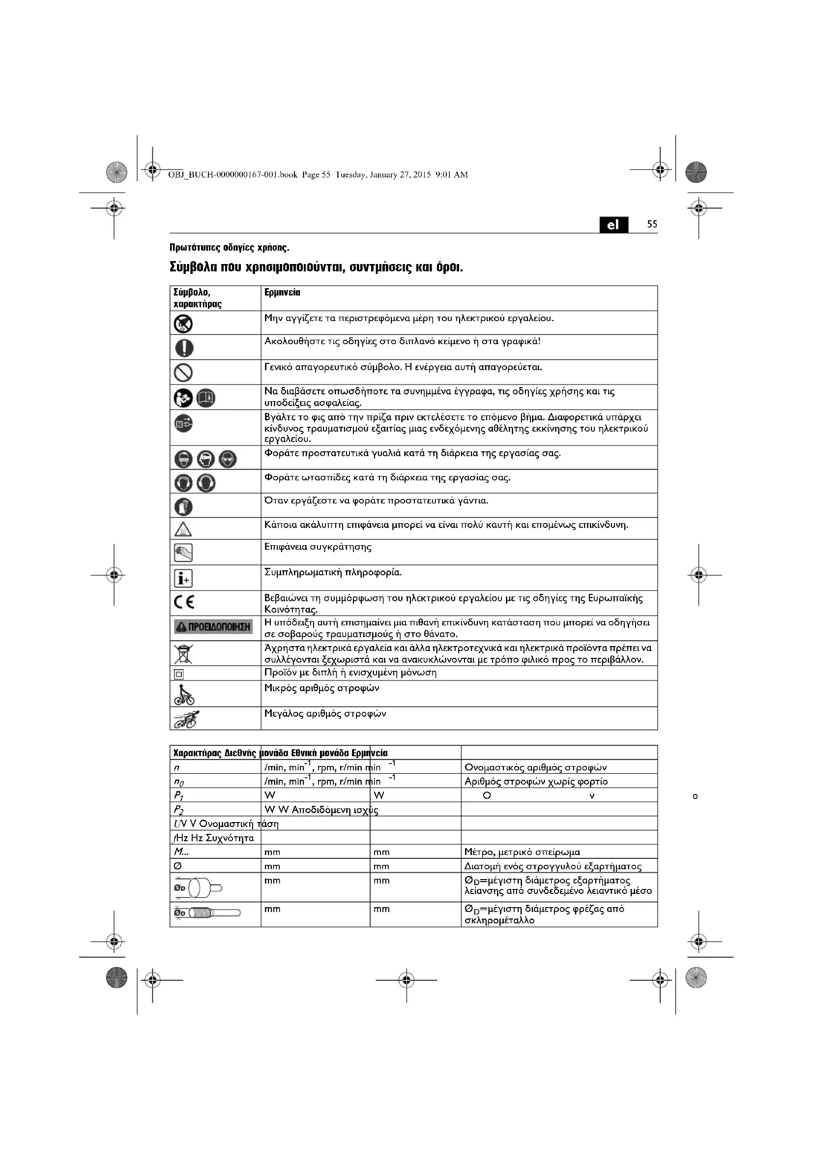 Φοράτε προστατευτικά γυαλιά κατά τη διάρκεια της εργασίας σας. Φοράτε ωτασπίδες κατά τη διάρκεια της εργασίας σας. Όταν εργάζεστε να φοράτε προστατευτικά γάντια. Κάποια ακάλυπτη επιφάνεια μπορεί να είναι πολύ καυτή και επομένως επικίνδυνη. Επιφάνεια συγκράτησης Συμπληρωματική πληροφορία. Βεβαιώνει τη συμμόρφωση του ηλεκτρικού εργαλείου με τις οδηγίες της Ευρωπαϊκής Κοινότητας. Η υπόδειξη αυτή επισημαίνει μια πιθανή επικίνδυνη κατάσταση που μπορεί να οδηγήσει σε σοβαρούς τραυματισμούς ή στο θάνατο. Άχρηστα ηλεκτρικά εργαλεία και άλλα ηλεκτροτεχνικά και ηλεκτρικά προϊόντα πρέπει να συλλέγονται ξεχωριστά και να ανακυκλώνονται με τρόπο φιλικό προς το περιβάλλον. Προϊόν με διπλή ή ενισχυμένη μόνωση Μικρός αριθμός στροφών Μεγάλος αριθμός στροφών Χαρακτήρας Διεθνής μονάδα Εθνική μονάδα Ερμηνεία
