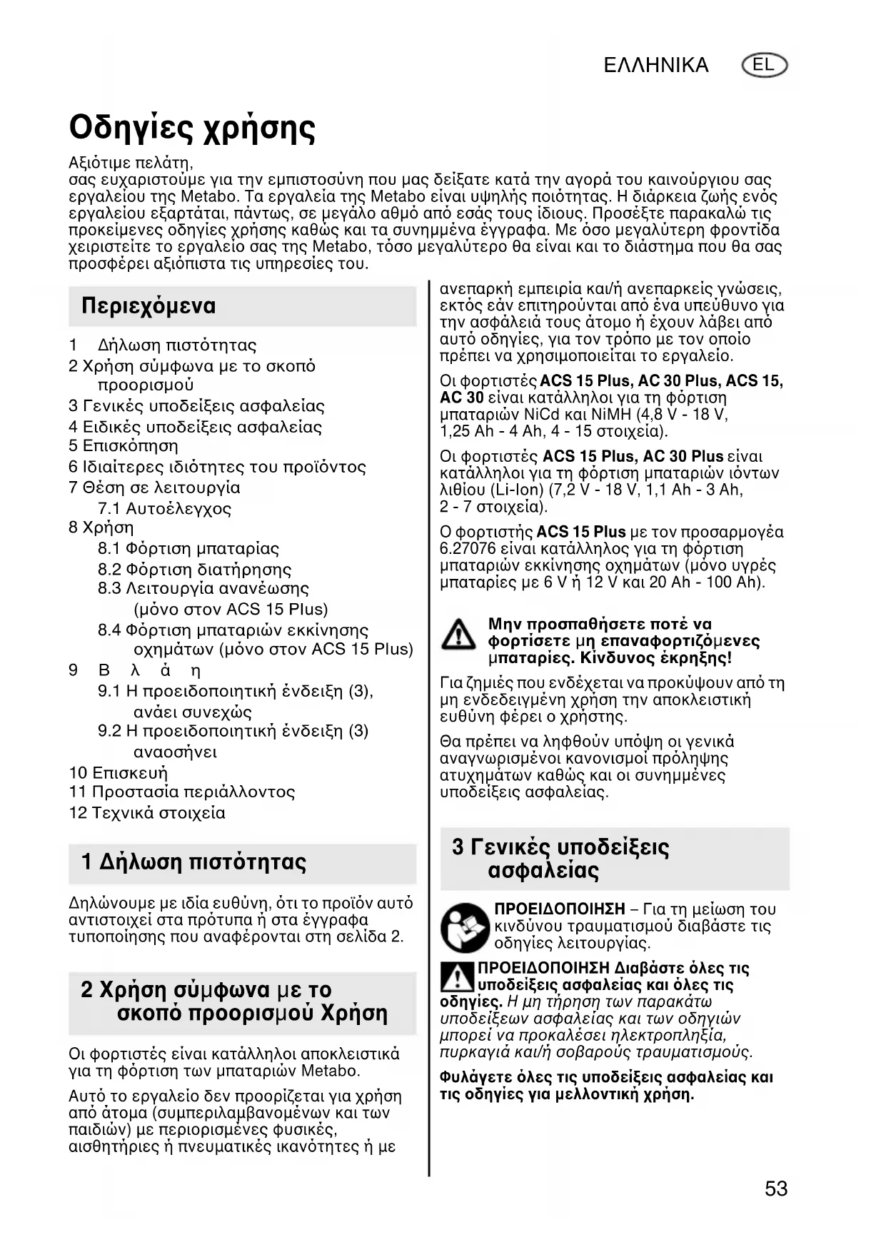10 Επισκευή 11 Προστασία περιάλλοντος 12 Τεχνικά στοιχεία ∆ηλώνουε ε ιδία ευθύνη, τι το προϊν αυτ αντιστοιχεί στα πρτυπα ή στα έγγραφα τυποποίησης που αναφέρονται στη σελίδα 2. Οι φορτιστές είναι κατάλληλοι αποκλειστικά για τη φρτιση των παταριών Metabo. Αυτ το εργαλείο δεν προορίζεται για χρήση απ άτοµα (συµπεριλαµβανοµένων και των παιδιών) µε περιορισµένες φυσικές, αισθητήριες ή πνευµατικές ικαντητες ή µε ανεπαρκή εµπειρία και/ή ανεπαρκείς γνώσεις, εκτς εάν επιτηρούνται απ ένα υπεύθυνο για την ασφάλειά τους άτοµο ή έχουν λάβει απ αυτ οδηγίες, για τον τρπο µε τον οποίο πρέπει να χρησιµοποιείται το εργαλείο. Οι φορτιστές ACS 15 Plus, AC 30 Plus, ACS 15, AC 30 είναι κατάλληλοι για τη φρτιση παταριών NiCd και NiMH (4,8 V - 18 V, 1,25 Ah - 4 Ah, 4 - 15 στοιχεία). Οι φορτιστές ACS 15 Plus, AC 30 Plus
