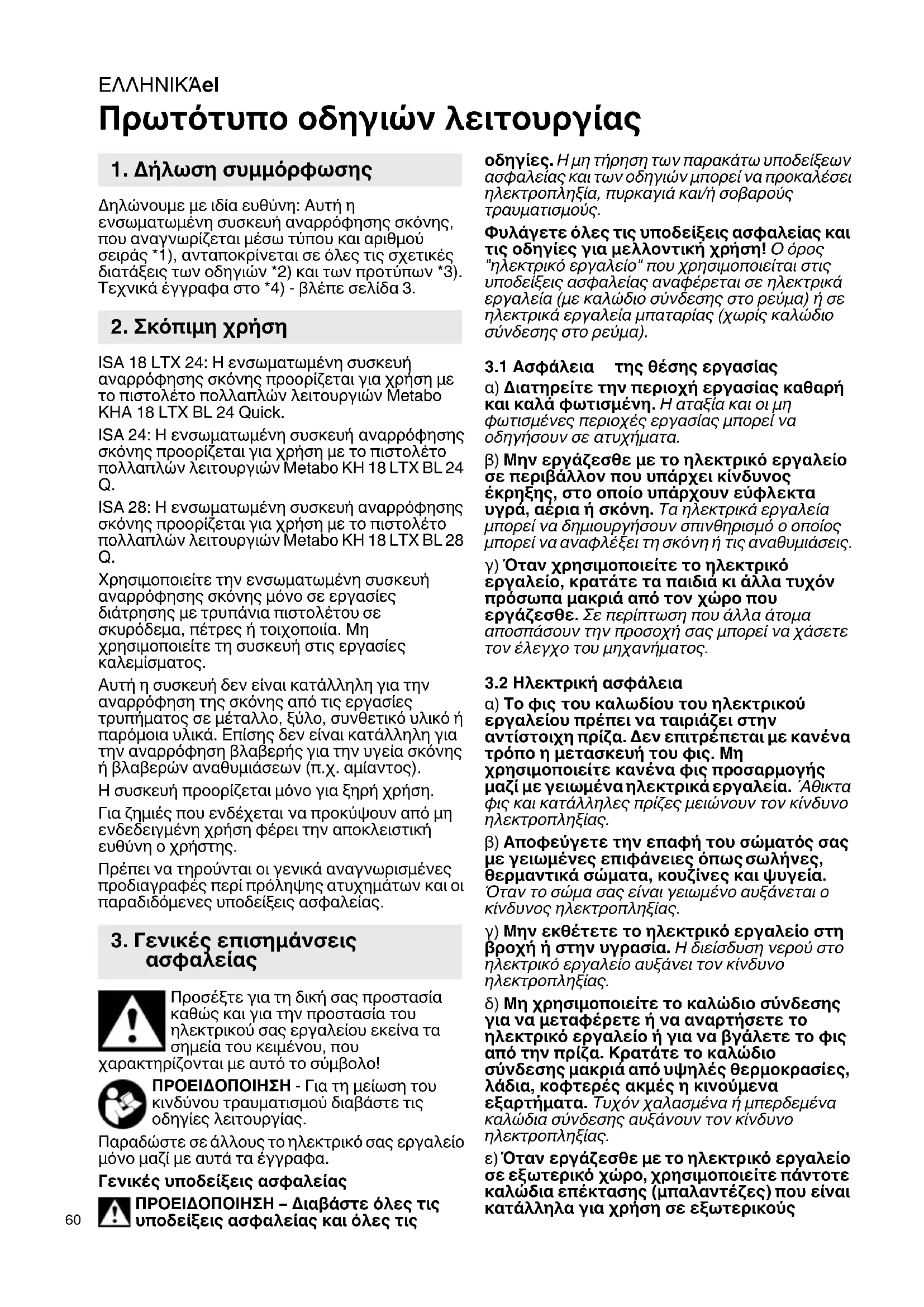 Πρωτότυπο οδηγιών λειτουργίας Δηλώνουμε με ιδία ευθύνη: Αυτή η ενσωματωμένη συσκευή αναρρόφησης σκόνης, που αναγνωρίζεται μέσω τύπου και αριθμού σειράς *1), ανταποκρίνεται σε όλες τις σχετικές διατάξεις των οδηγιών *2) και των προτύπων *3). Τεχνικά έγγραφα στο *4) - βλέπε σελίδα 3. ISA 18 LTX 24: Η ενσωματωμένη συσκευή αναρρόφησης σκόνης προορίζεται για χρήση με το πιστολέτο πολλαπλών λειτουργιών Metabo KHA 18 LTX BL 24 Quick. ISA 24: Η ενσωματωμένη συσκευή αναρρόφησης σκόνης προορίζεται για χρήση με το πιστολέτο πολλαπλών λειτουργιών Metabo KH 18 LTX BL 24