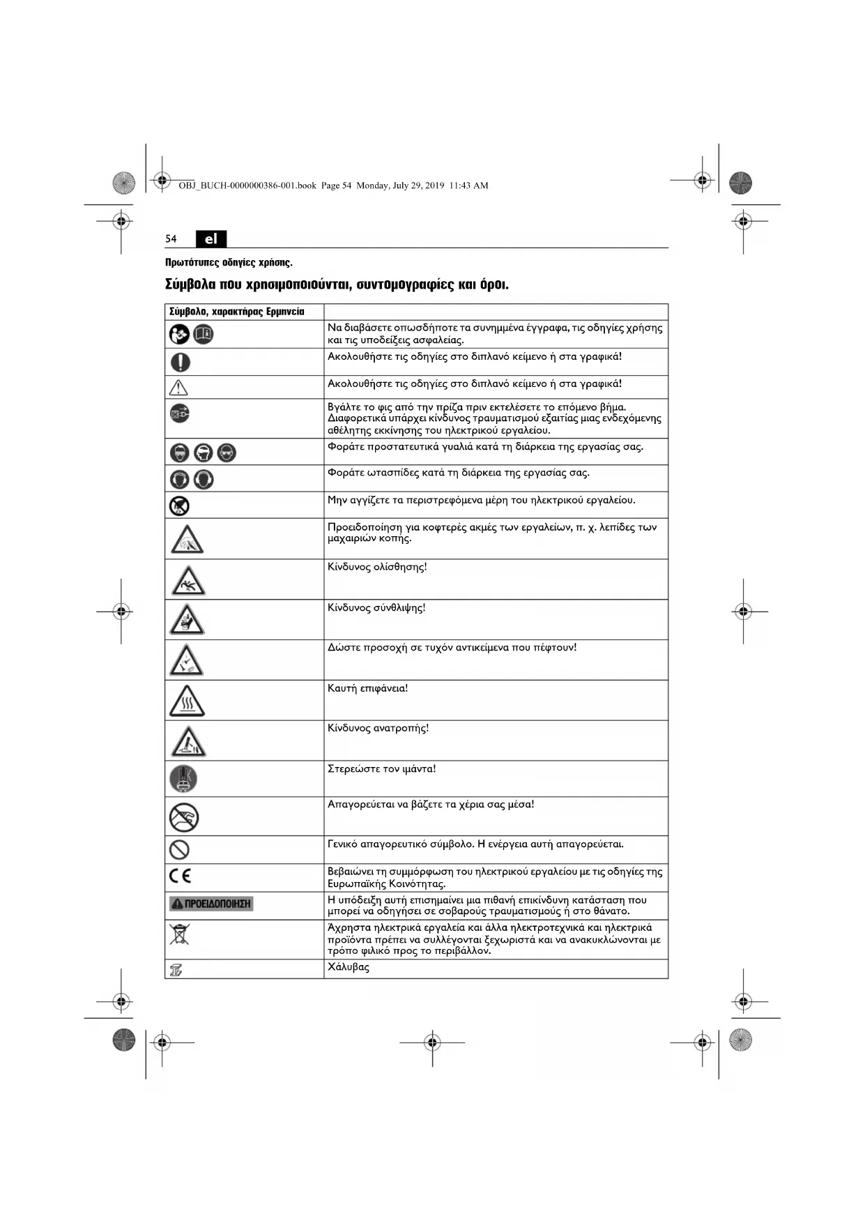 Πρωτότυπες οδηγίες χρήσης. Σύμβολα που χρησιμοποιούνται, συντομογραφίες και όροι. Σύμβολο, χαρακτήρας Ερμηνεία Να διαβάσετε οπωσδήποτε τα συνημμένα έγγραφα, τις οδηγίες χρήσης και τις υποδείξεις ασφαλείας. Ακολουθήστε τις οδηγίες στο διπλανό κείμενο ή στα γραφικά! Ακολουθήστε τις οδηγίες στο διπλανό κείμενο ή στα γραφικά! Βγάλτε το φις από την πρίζα πριν εκτελέσετε το επόμενο βήμα. Διαφορετικά υπάρχει κίνδυνος τραυματισμού εξαιτίας μιας ενδεχόμενης αθέλητης εκκίνησης του ηλεκτρικού εργαλείου. Φοράτε προστατευτικά γυαλιά κατά τη διάρκεια της εργασίας σας. Φοράτε ωτασπίδες κατά τη διάρκεια της εργασίας σας. Μην αγγίζετε τα περιστρεφόμενα μέρη του ηλεκτρικού εργαλείου. Προειδοποίηση για κοφτερές ακμές των εργαλείων, π. χ. λεπίδες των μαχαιριών κοπής. Κίνδυνος ολίσθησης! Κίνδυνος σύνθλιψης! Δώστε προσοχή σε τυχόν αντικείμενα που πέφτουν! Καυτή επιφάνεια! Κίνδυνος ανατροπής! Στερεώστε τον ιμάντα! Απαγορεύεται να βάζετε τα χέρια σας μέσα! Γενικό απαγορευτικό σύμβολο. Η ενέργεια αυτή απαγορεύεται. Βεβαιώνει τη συμμόρφωση του ηλεκτρικού εργαλείου με τις οδηγίες της Ευρωπαϊκής Κοινότητας. Η υπόδειξη αυτή επισημαίνει μια πιθανή επικίνδυνη κατάσταση που μπορεί να οδηγήσει σε σοβαρούς τραυματισμούς ή στο θάνατο. Άχρηστα ηλεκτρικά εργαλεία και άλλα ηλεκτροτεχνικά και ηλεκτρικά προϊόντα πρέπει να συλλέγονται ξεχωριστά και να ανακυκλώνονται με τρόπο φιλικό προς το περιβάλλον.