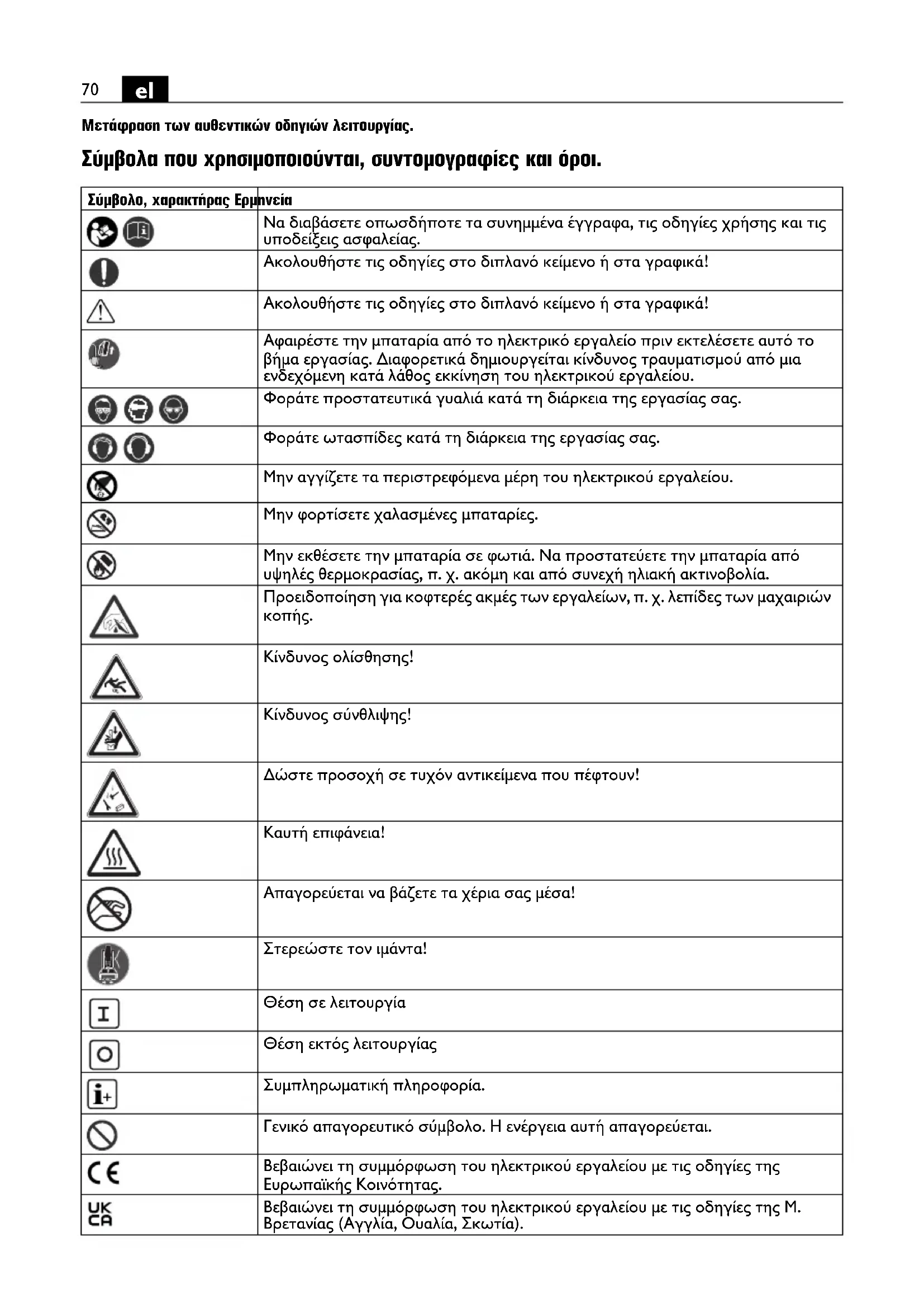 Κίνδυνος ολίσθησης! Κίνδυνος σύνθλιψης! Δώστε προσοχή σε τυχόν αντικείμενα που πέφτουν! Καυτή επιφάνεια! Απαγορεύεται να βάζετε τα χέρια σας μέσα! Στερεώστε τον ιμάντα! Θέση σε λειτουργία Θέση εκτός λειτουργίας Συμπληρωματική πληροφορία. Γενικό απαγορευτικό σύμβολο. Η ενέργεια αυτή απαγορεύεται. Βεβαιώνει τη συμμόρφωση του ηλεκτρικού εργαλείου με τις οδηγίες της Ευρωπαϊκής Κοινότητας. Βεβαιώνει τη συμμόρφωση του ηλεκτρικού εργαλείου με τις οδηγίες της Μ. Βρετανίας (Αγγλία, Ουαλία, Σκωτία).71