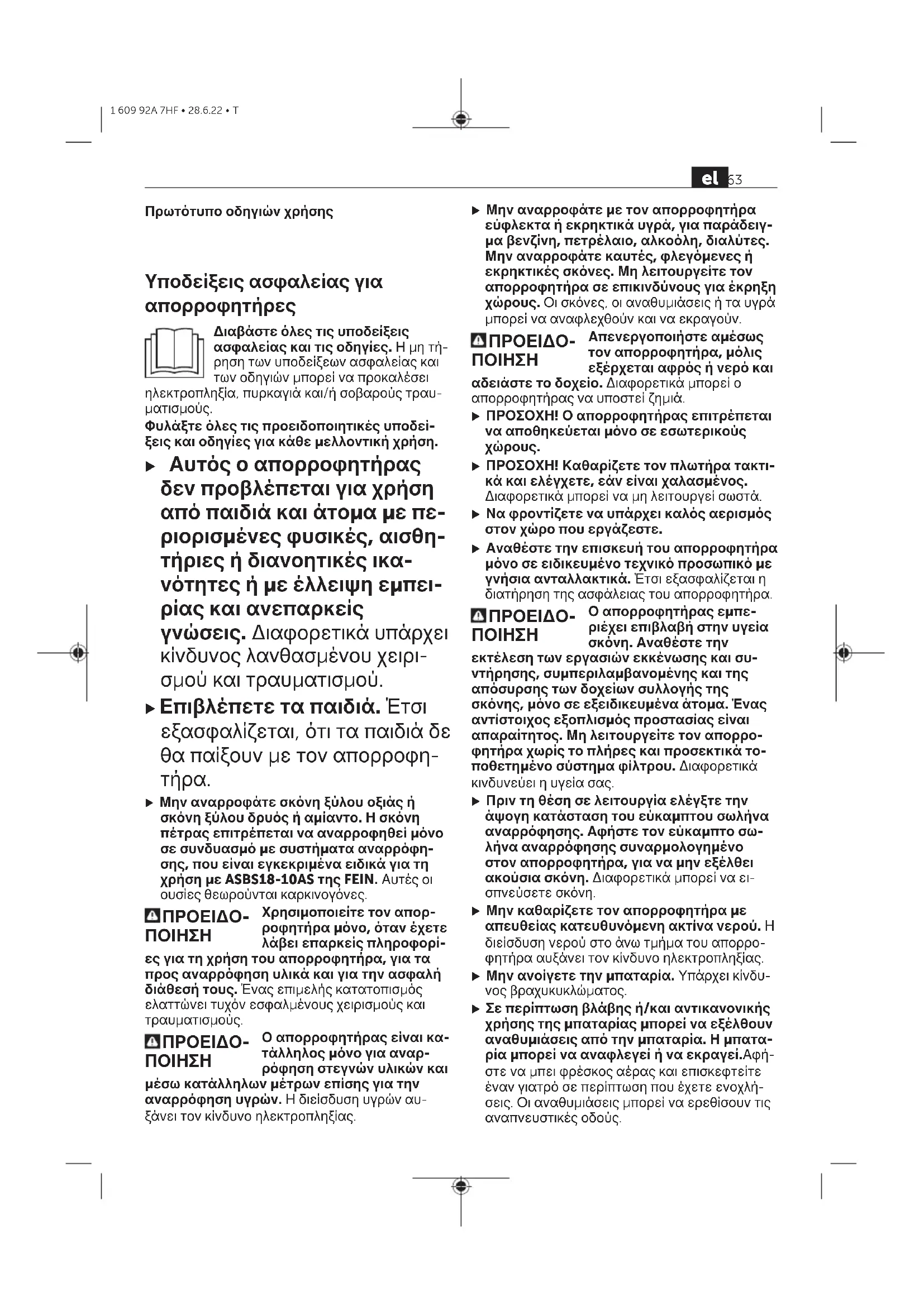 Φυλάξτε όλες τις προειδοποιητικές υποδεί- ξεις και οδηγίες για κάθε μελλοντική χρήση. u Αυτός ο απορροφητήρας δεν προβλέπεται για χρήση από παιδιά και άτομα με πε- ριορισμένες φυσικές, αισθη- τήριες ή διανοητικές ικα- νότητες ή με έλλειψη εμπει- ρίας και ανεπαρκείς γνώσεις. Διαφορετικά υπάρχει κίνδυνος λανθασμένου χειρι- σμού και τραυματισμού. u Επιβλέπετε τα παιδιά. Έτσι εξασφαλίζεται, ότι τα παιδιά δε θα παίξουν με τον απορροφη-