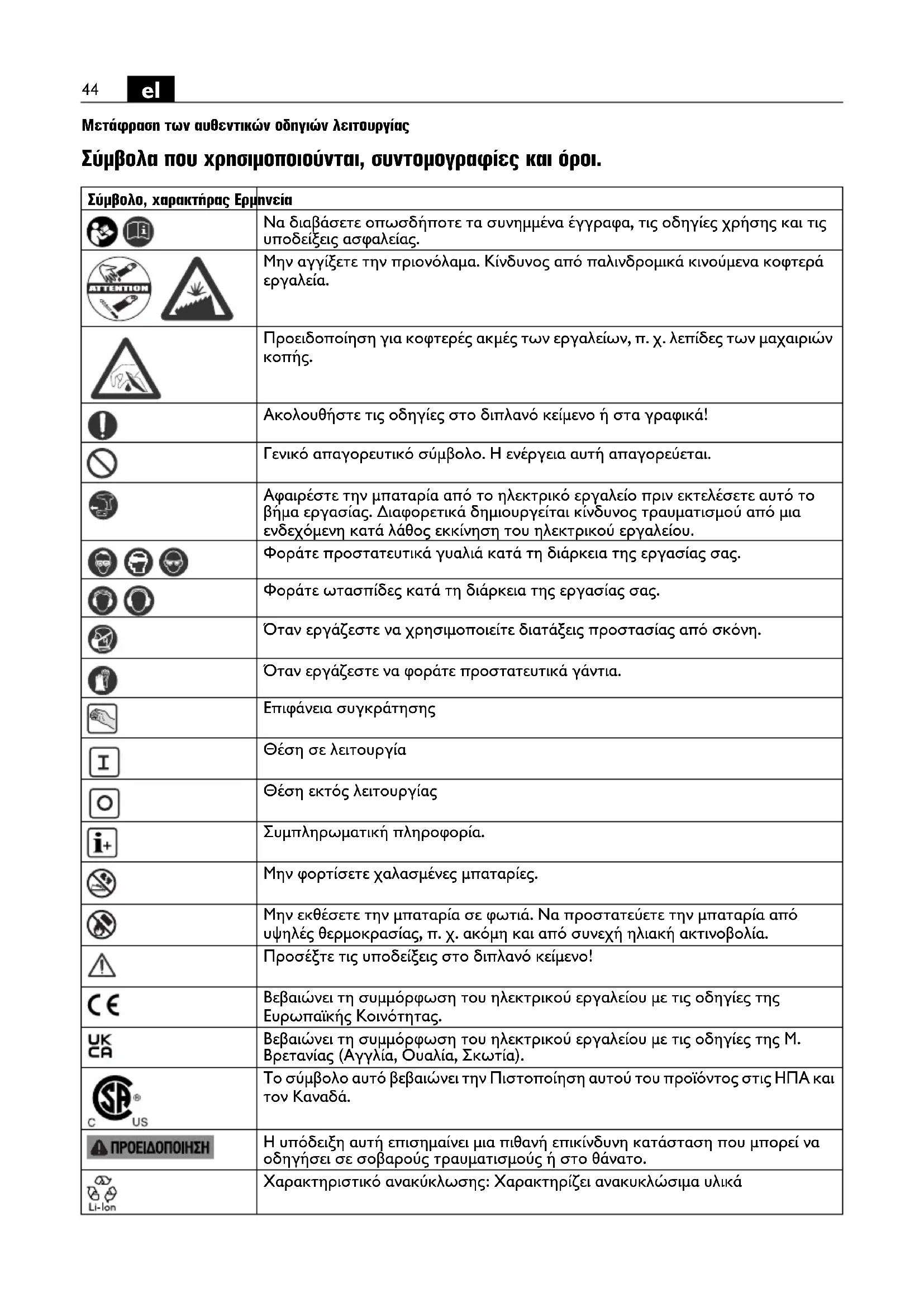 Ακολουθήστε τις οδηγίες στο διπλανό κείμενο ή στα γραφικά! Γενικό απαγορευτικό σύμβολο. Η ενέργεια αυτή απαγορεύεται. Αφαιρέστε την μπαταρία από το ηλεκτρικό εργαλείο πριν εκτελέσετε αυτό το βήμα εργασίας. Διαφορετικά δημιουργείται κίνδυνος τραυματισμού από μια ενδεχόμενη κατά λάθος εκκίνηση του ηλεκτρικού εργαλείου. Φοράτε προστατευτικά γυαλιά κατά τη διάρκεια της εργασίας σας. Φοράτε ωτασπίδες κατά τη διάρκεια της εργασίας σας. Όταν εργάζεστε να χρησιμοποιείτε διατάξεις προστασίας από σκόνη. Όταν εργάζεστε να φοράτε προστατευτικά γάντια. Επιφάνεια συγκράτησης Θέση σε λειτουργία Θέση εκτός λειτουργίας Συμπληρωματική πληροφορία. Μην φορτίσετε χαλασμένες μπαταρίες. Μην εκθέσετε την μπαταρία σε φωτιά. Να προστατεύετε την μπαταρία από υψηλές θερμοκρασίας, π. χ. ακόμη και από συνεχή ηλιακή ακτινοβολία. Προσέξτε τις υποδείξεις στο διπλανό κείμενο! Βεβαιώνει τη συμμόρφωση του ηλεκτρικού εργαλείου με τις οδηγίες της Ευρωπαϊκής Κοινότητας. Βεβαιώνει τη συμμόρφωση του ηλεκτρικού εργαλείου με τις οδηγίες της Μ. Βρετανίας (Αγγλία, Ουαλία, Σκωτία). Το σύμβολο αυτό βεβαιώνει την Πιστοποίηση αυτού του προϊόντος στις ΗΠΑ και τον Καναδά. Η υπόδειξη αυτή επισημαίνει μια πιθανή επικίνδυνη κατάσταση που μπορεί να οδηγήσει σε σοβαρούς τραυματισμούς ή στο θάνατο. Χαρακτηριστικό ανακύκλωσης: Χαρακτηρίζει ανακυκλώσιμα υλικά45