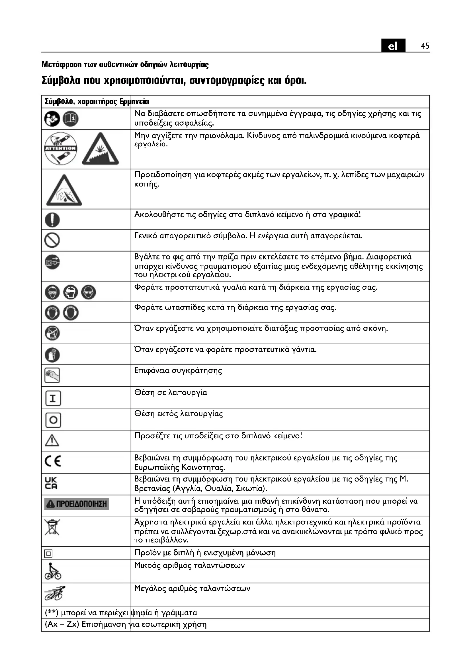Ακολουθήστε τις οδηγίες στο διπλανό κείμενο ή στα γραφικά! Γενικό απαγορευτικό σύμβολο. Η ενέργεια αυτή απαγορεύεται. Βγάλτε το φις από την πρίζα πριν εκτελέσετε το επόμενο βήμα. Διαφορετικά υπάρχει κίνδυνος τραυματισμού εξαιτίας μιας ενδεχόμενης αθέλητης εκκίνησης του ηλεκτρικού εργαλείου. Φοράτε προστατευτικά γυαλιά κατά τη διάρκεια της εργασίας σας. Φοράτε ωτασπίδες κατά τη διάρκεια της εργασίας σας. Όταν εργάζεστε να χρησιμοποιείτε διατάξεις προστασίας από σκόνη. Όταν εργάζεστε να φοράτε προστατευτικά γάντια. Επιφάνεια συγκράτησης Θέση σε λειτουργία Θέση εκτός λειτουργίας Προσέξτε τις υποδείξεις στο διπλανό κείμενο! Βεβαιώνει τη συμμόρφωση του ηλεκτρικού εργαλείου με τις οδηγίες της Ευρωπαϊκής Κοινότητας. Βεβαιώνει τη συμμόρφωση του ηλεκτρικού εργαλείου με τις οδηγίες της Μ. Βρετανίας (Αγγλία, Ουαλία, Σκωτία). Η υπόδειξη αυτή επισημαίνει μια πιθανή επικίνδυνη κατάσταση που μπορεί να οδηγήσει σε σοβαρούς τραυματισμούς ή στο θάνατο. Άχρηστα ηλεκτρικά εργαλεία και άλλα ηλεκτροτεχνικά και ηλεκτρικά προϊόντα πρέπει να συλλέγονται ξεχωριστά και να ανακυκλώνονται με τρόπο φιλικό προς το περιβάλλον. Προϊόν με διπλή ή ενισχυμένη μόνωση Μικρός αριθμός ταλαντώσεων Μεγάλος αριθμός ταλαντώσεων (**) μπορεί να περιέχει ψηφία ή γράμματα (Ax – Zx) Επισήμανση για εσωτερική χρήση46