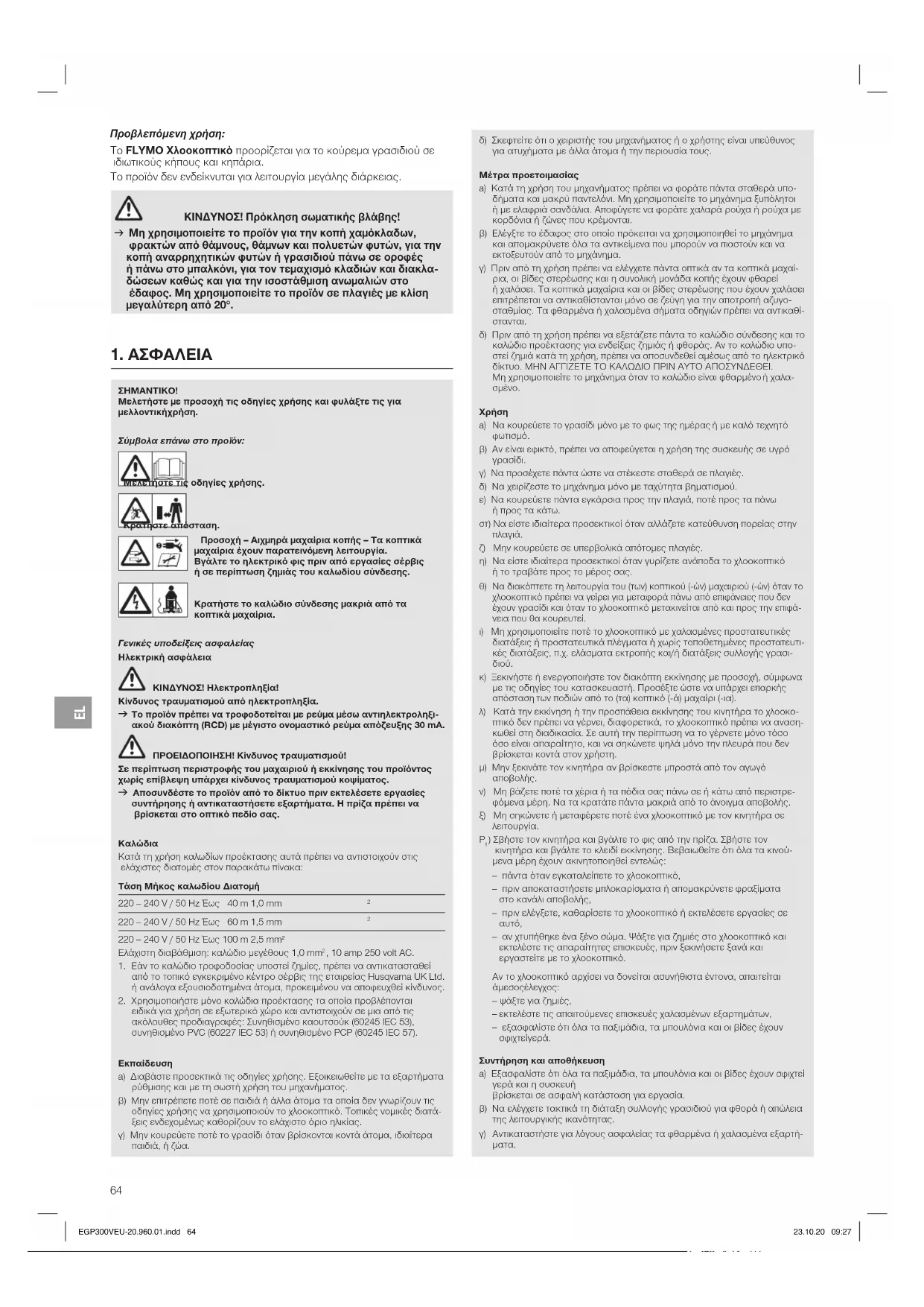 Παρακαλούμε επικοινωνήστε με τη διεύθυνση στην πίσω σελίδα. Δήλωση εγγύησης: Σε περίπτωση αξίωσης εγγύησης, δεν επιβαρύνεστε με χρεώσεις για τις παρεχόμενες υπηρεσίες. Η FLYMO παρέχει για όλα τα γνήσια καινούργια προϊόντα FLYMO εγγύηση 2 ετών από την ημερομηνία της πρώτης αγοράς από τον αντι- πρόσωπο, όταν τα προϊόντα χρησιμοποιούνται αποκλειστικά για ιδιωτι- κή χρήση. Αυτή η εγγύηση κατασκευαστή δεν ισχύει για προϊόντα που έχουν αποκτηθεί στη δευτερογενή αγορά. Αυτή η εγγύηση αφορά σε σημα ντικά ελαττώματα του προϊόντος που οφείλονται αποδεδειγμένα σε σφάλματα υλικού ή κατα σκευής. Η παρούσα εγγύηση εκπληρώνεται με την παροχή ενός πλήρως λειτουργικού προϊόντος αντικατάστασης ήμε τη δωρεάν επισκευή του ελαττωματικού προϊόντος. Διατηρούμε το δικαί ωμα επιλογής. Αυτή η υπηρεσία ισχύει εφόσον πληρούνται οι παρακάτω προϋποθέσεις: EGP300VEU-20.960.01.indd 67 23.10.20 09:27EL