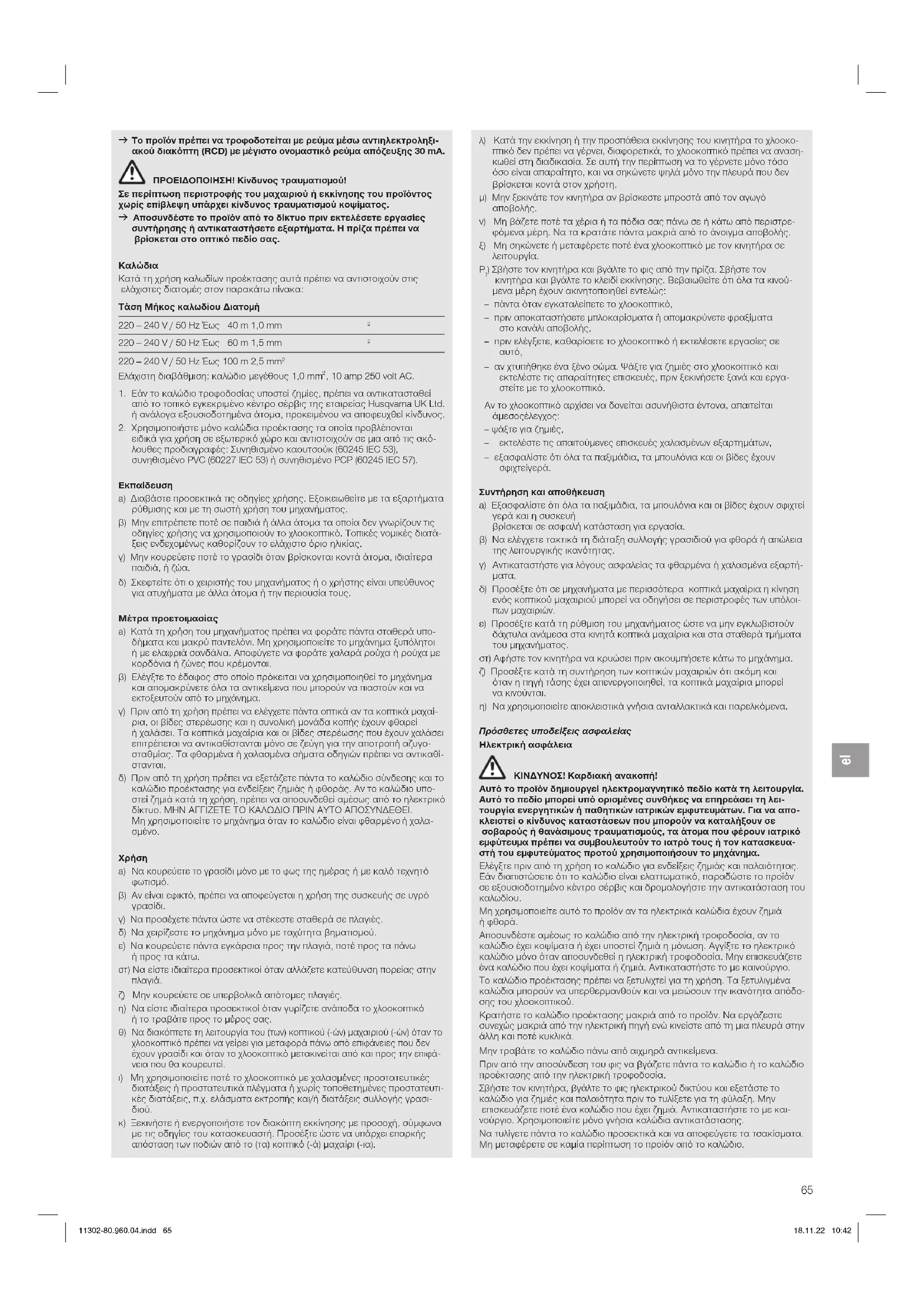 Αποσυνδέστε αμέσως το καλώδιο από την ηλεκτρική τροφοδοσία, αν το καλώδιο έχει κοψίματα ή έχει υποστεί ζημιά η μόνωση. Αγγίξτε το ηλεκτρικό καλώδιο μόνο όταν αποσυνδεθεί η ηλεκτρική τροφοδοσία. Μην επισκευάζετε ένα καλώδιο που έχει κοψίματα ή ζημιά. Αντικαταστήστε το με καινούργιο. Το καλώδιο προέκτασης πρέπει να ξετυλιχτεί για τη χρήση. Τα ξετυλιγμένα καλώδια μπορούν να υπερθερμανθούν και να μειώσουν την ικανότητα απόδο- σης του χλοοκοπτικού. Κρατήστε το καλώδιο προέκτασης μακριά από το προϊόν. Να εργάζεστε συνεχώς μακριά από την ηλεκτρική πηγή ενώ κινείστε από τη μια πλευρά στην άλλη και ποτέ κυκλικά. Μην τραβάτε το καλώδιο πάνω από αιχμηρά αντικείμενα. Πριν από την αποσύνδεση του φις να βγάζετε πάντα το καλώδιο ή το καλώδιο προέκτασης από την ηλεκτρική τροφοδοσία. Σβήστε τον κινητήρα, βγάλτε το φις ηλεκτρικού δικτύου και εξετάστε το καλώδιο για ζημιές και παλαιότητα πριν το τυλίξετε για τη φύλαξη. Μην επισκευάζετε ποτέ ένα καλώδιο που έχει ζημιά. Αντικαταστήστε το με και- νούργιο. Χρησιμοποιείτε μόνο γνήσια καλώδια αντικατάστασης. Να τυλίγετε πάντα το καλώδιο προσεκτικά και να αποφεύγετε τα τσακίσματα. Μη μεταφέρετε σε καμία περίπτωση το προϊόν από το καλώδιο. 11302-80.960.04.indd 6511302-80.960.04.indd 65 18.11.22 10:4218.11.22 10:4266