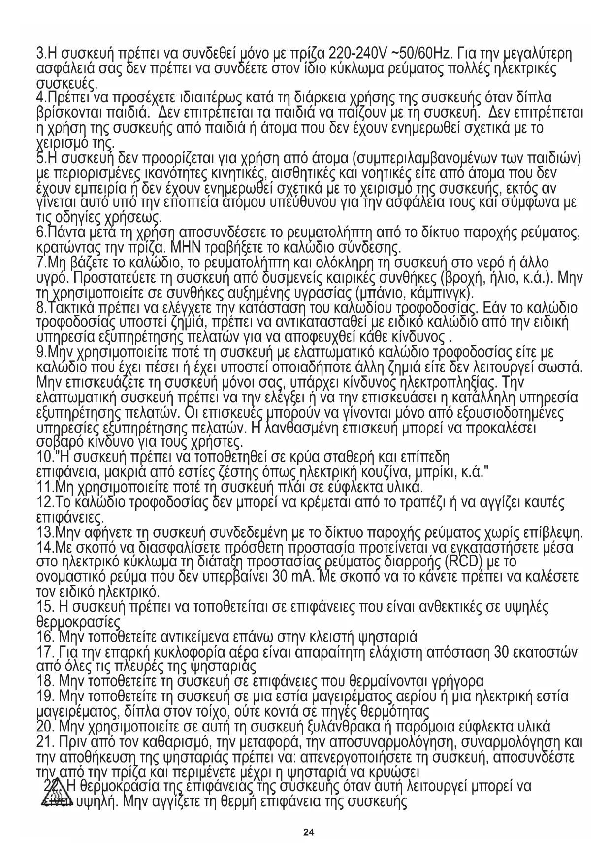 ΓΕΝΙΚΟΙ ΚΑΝΟΝΕΣ ΑΣΦΑΛΕΙΑΣ 1.Πριν από τη χρήση της συσκευής πρέπει να διαβάσετε τις οδηγίες χρήσεως και να τις ακολουθήσετε. Ο παραγωγός δεν ευθύνεται για ενδεχόμενες ζημιές που οφείλονται σε μη ενδεδειγμένη χρήση ή σε λάθος χειρισμό της συσκευής. 2.Η συσκευή προορίζεται για οικιακή χρήση. Απαγορεύεται η χρήση της για άλλους σκοπούς, για τους οποίους δεν προορίζεται.24