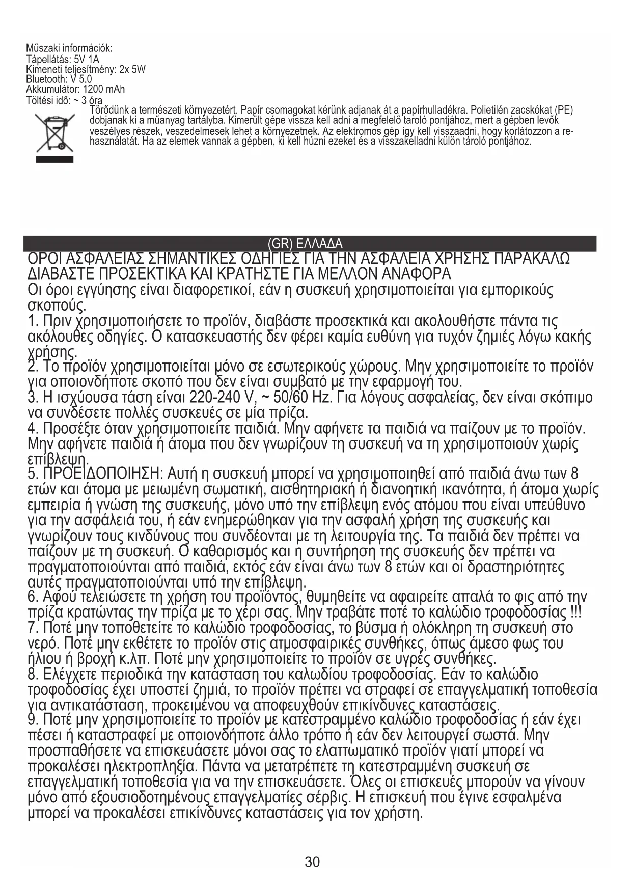 Κακή ποιότητα ήχου: Βεβαιωθείτε ότι η συσκευή έχει εμβέλεια Bluetooth. φροντίζουμε το φυσικό περιβάλλον. Παρακαλούμε να πετάτε τις συσκευασίες από χαρτόνι στον κάδο ανακύκλωσης απορριμμάτων χαρτιού. Τις σακούλες από πολυαιθυλένιο (ΡΕ), απορρίψτε τις στον κάδο ανακύκλωσης πλαστικών. Η φθαρμένη συσκευή πρέπει να απορρίπτεται στο κατάλληλο σημείο, εξαιτίας των επικίνδυνων στοιχείων που περιέχει και τα οποία μπορεί να αποτελέσουν απειλή για το περιβάλλον. Η ηλεκτρική συσκευή πρέπει να απορρίπτεται με τέτοιο τρόπο ώστε να περιοριστεί η επαναχρησιμοποίηση της. Εάν στη συσκευή βρίσκονται μπαταρίες, αυτές πρέπει να αφαιρεθούν και να πεταχτούν σε ξεχωριστό κάδο.33 (MK) Mакедонски